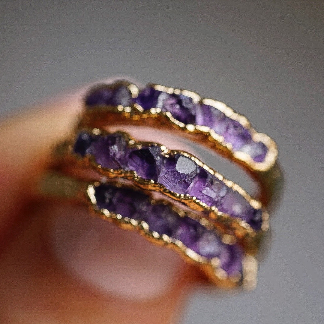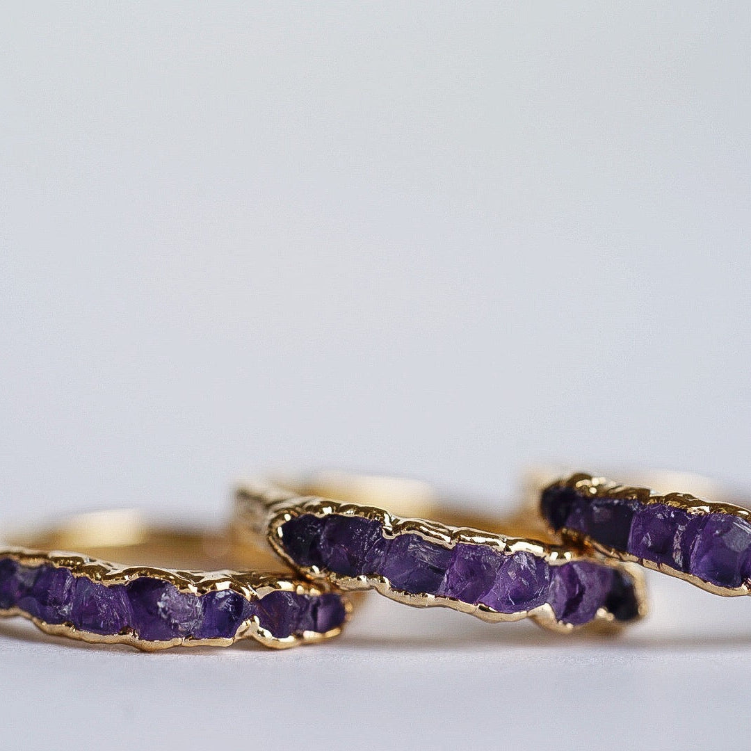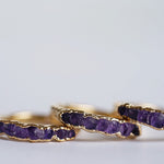 The Amethyst Mini Multi Stone Rings are simple yet are sure to make a statement. They are adorned with 7-9 smaller Amethyst stones randomly placed on a hammered band for a more minimal design and can be a daily wearer. We love them best in a ring stack with a couple of our add-on bands. Can’t wait to see the ring stack you come up with!
