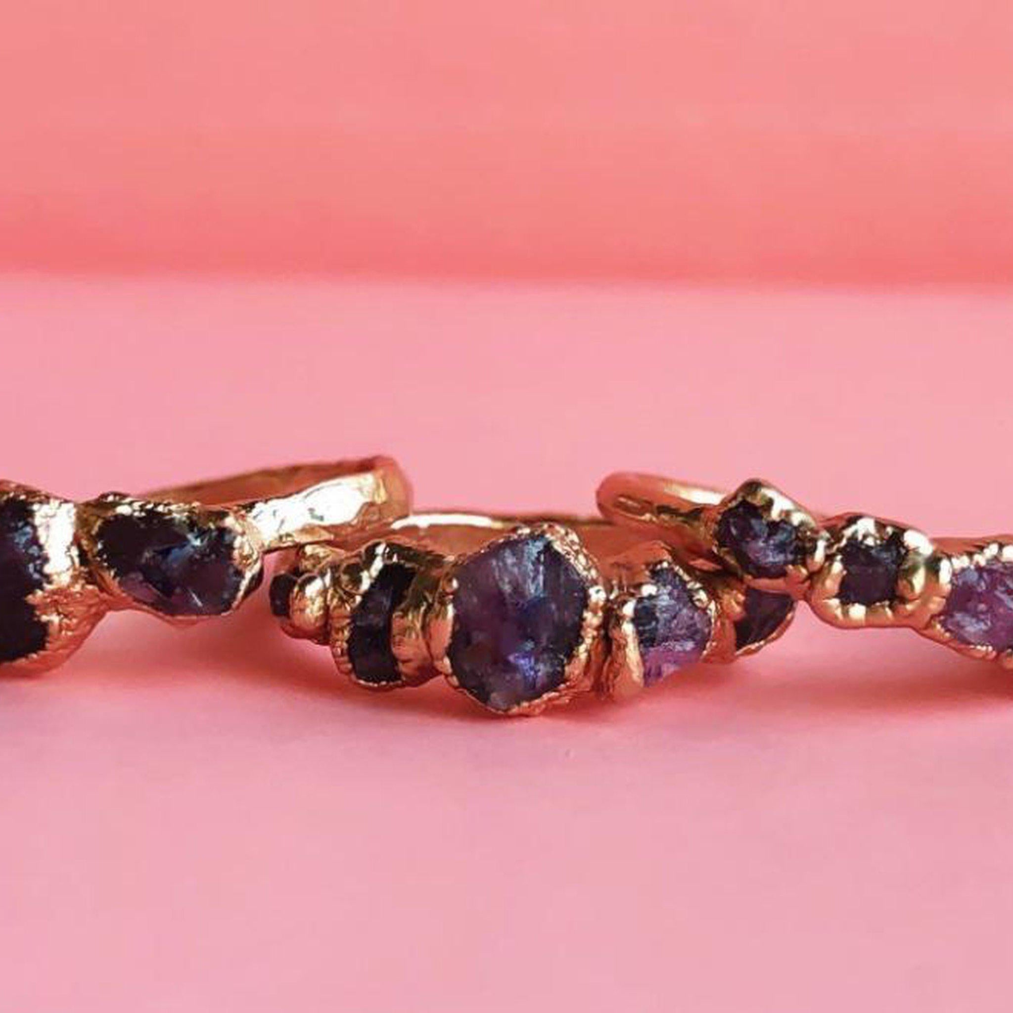 Each stone ring is made using a unique process called electroforming. We take a simple hammered copper band (or sterling silver band with the solid silver core option) and transform it into a one of a kind piece that is sure to catch the eyes and capture the hearts of everyone that sees it. We take special care in hand selecting and placing each stone on the band. This is the most critical step because it determines the final design of the ring. The ring is then placed in a solution for up to 14 hours while the metal (pure copper or pure silver depending on which option you choose) builds up and forms all around the stones. We are constantly checking on them to be sure they are forming exactly as they should be. This is so exciting to watch because each one forms in its own unique way. They are then tumbled to perfection and plated with the thickest and highest quality plating possible. This process is similar to the electroforming process. When the plating is complete, they are sealed and then sealed again to make sure they will stay as good as new with everyday wear. See our Care Instructions on how to keep your precious gems in tip top shape.