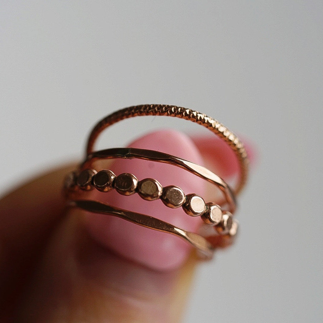 - Includes 3 stacking bands. One dotted band, one hammered bands (two are currently shown) and one thin glitter bands. All bands are gold filled, rose gold filled, or sterling silver.