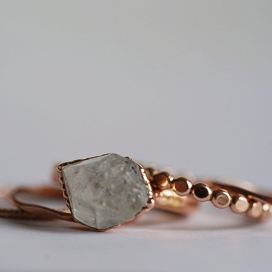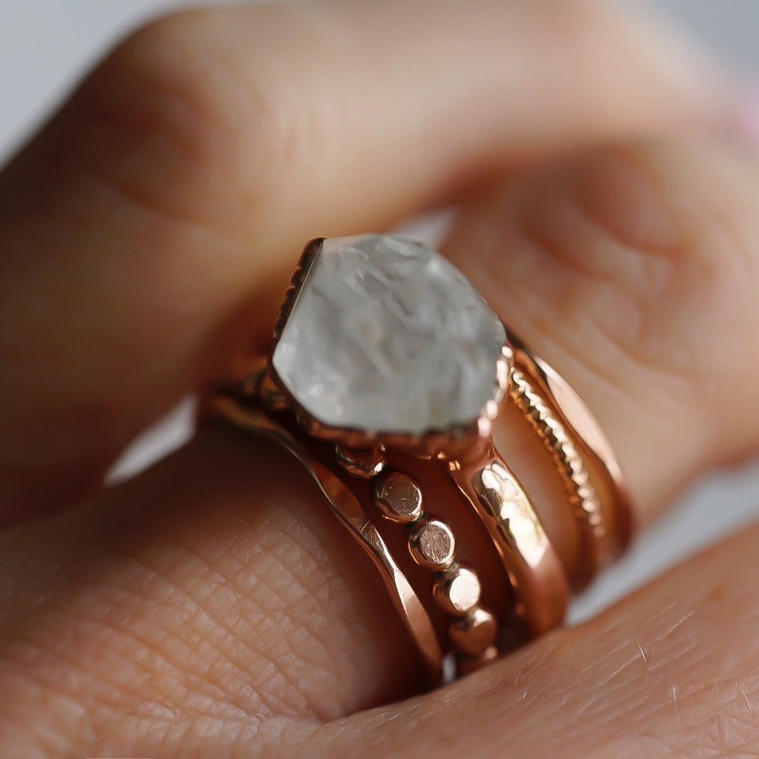 The very first item we ever released when we started Indigo Row but it is all new and improved! We upgraded all bands and it is much higher quality than the OG. Includes a Single Stone Diamond Quartz Ring and 4 stacking bands. Available in Gold, Rose Gold and silver.