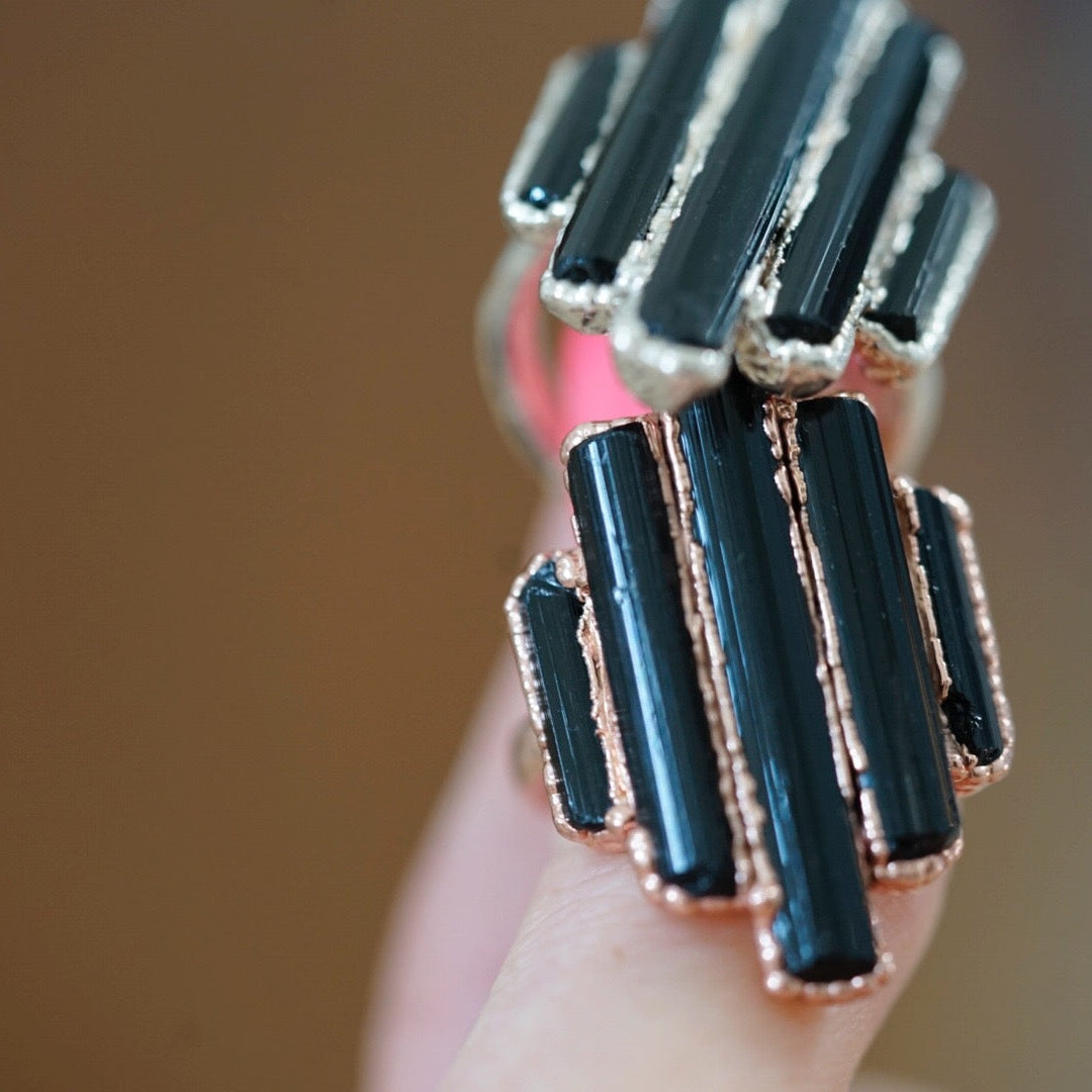 The Statement Cathedral Ring is adorned with large, high quality, Black Tourmaline stones aligned in a row on top of a simple hammered band. This ring is sure to stand out and make a statement with its size & beauty! Black Tourmaline is known as the stone of protection and this is one of our most popular designs. This piece can be made with either a copper or solid silver core.