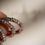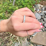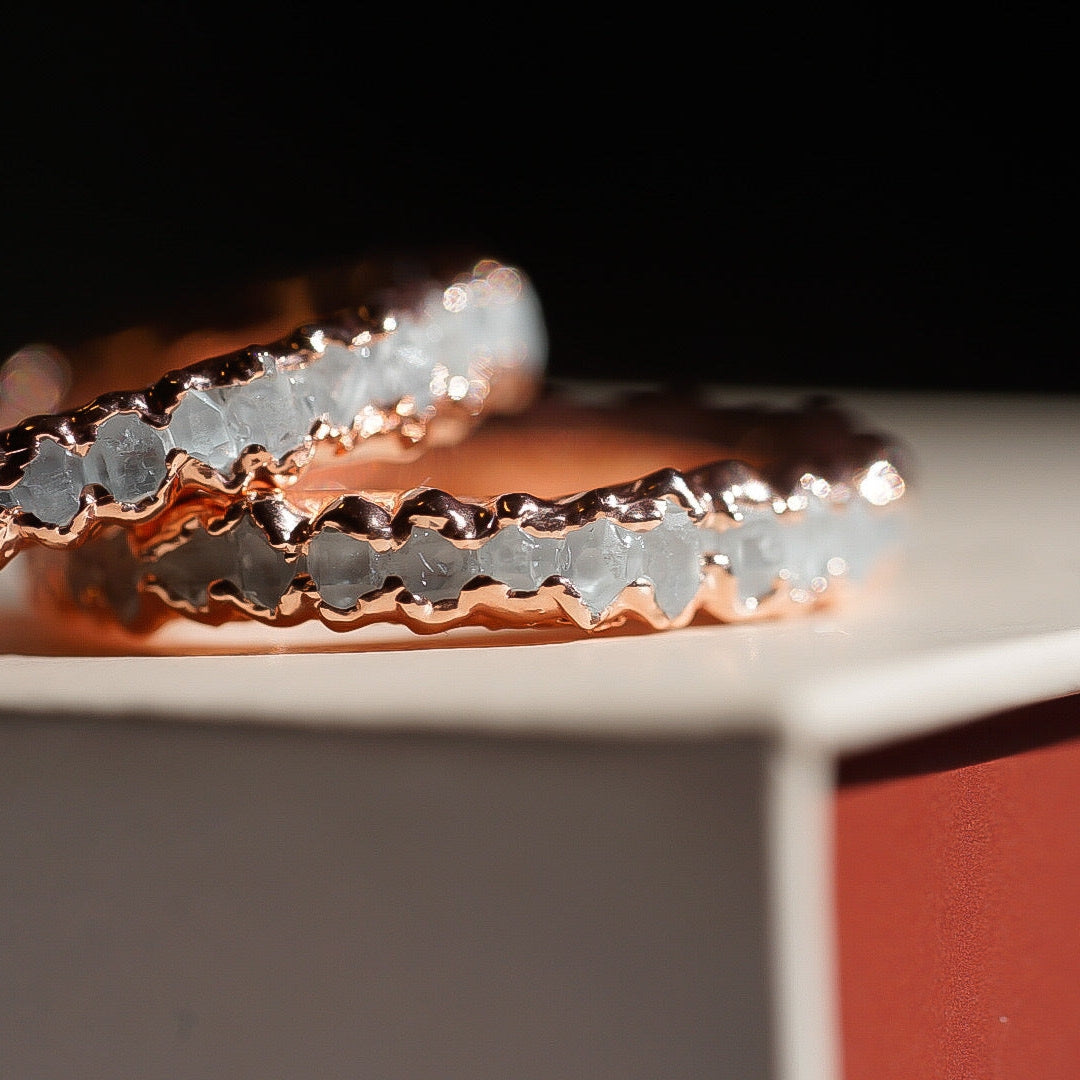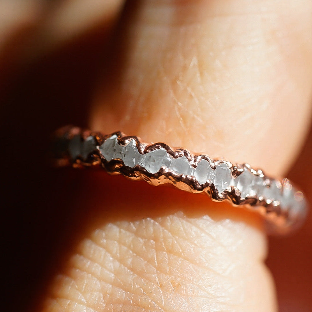 The newest addition to our Lovebird Collection is here and it has been one of our most requested pieces since we first gave you a peek. Sooooo much time goes into each one of these pieces. The Eternity Ring is adorned with several high quality Diamond Quartz stones from either Pakistan or the Herkimer Mines in New York. The stones wrap all the way around the band. Looks beautiful paired with other pieces in the Lovebird collection, add on bands, your own sentimental pieces, or all by itself.