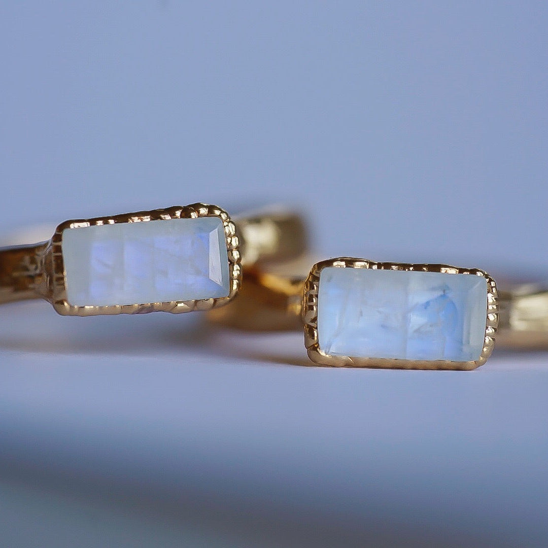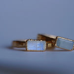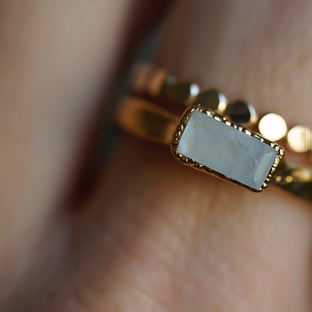 The Moonstone Minimalist Ring is adorned with a single semi-faceted Moonstone set on a simple hammered band in the metal of your choice. Our minimalist style rings are more dainty and more delicate than our regular single stone rings. Looks beautiful by itself or even more gorgeous layered in between one or a few of our stacking bands.