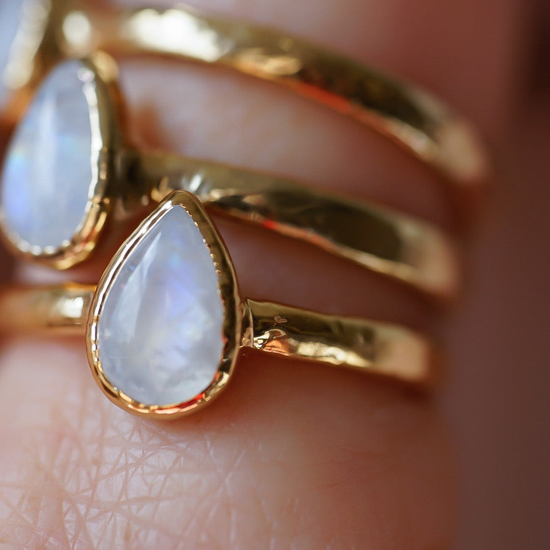 The Pear Shaped Moonstone Ring is adorned with a single cut & polished pear shaped moonstone set on a simple hammered band in the metal of your choice. This style is more minimal and dainty than our regular single stone rings. Looks beautiful by itself or even more gorgeous layered in between one or a few of our stacking bands.