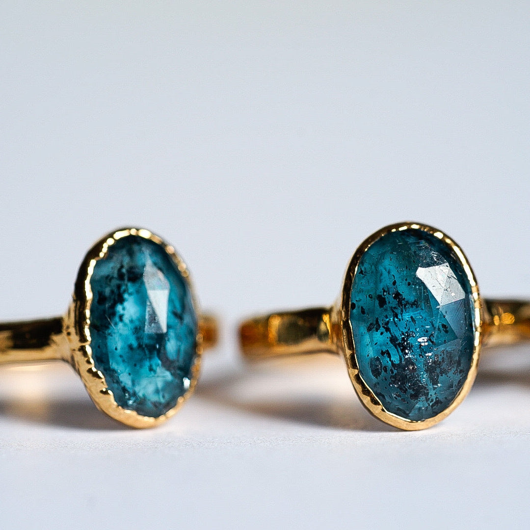 The Sea Foam Moss Kyanite ring is here! These are hand-crafted with a medium sized Moss Kyanite Rose Cut stone. They are the most gorgeous sea foam color and no two stones are the same so yours will be unique and one of a kind. Looks beautiful by itself or even more gorgeous layered in between one or a few of our simple stacking bands. You'll have people coming out of the wood works to admire its beauty no matter how you decide to wear it.
