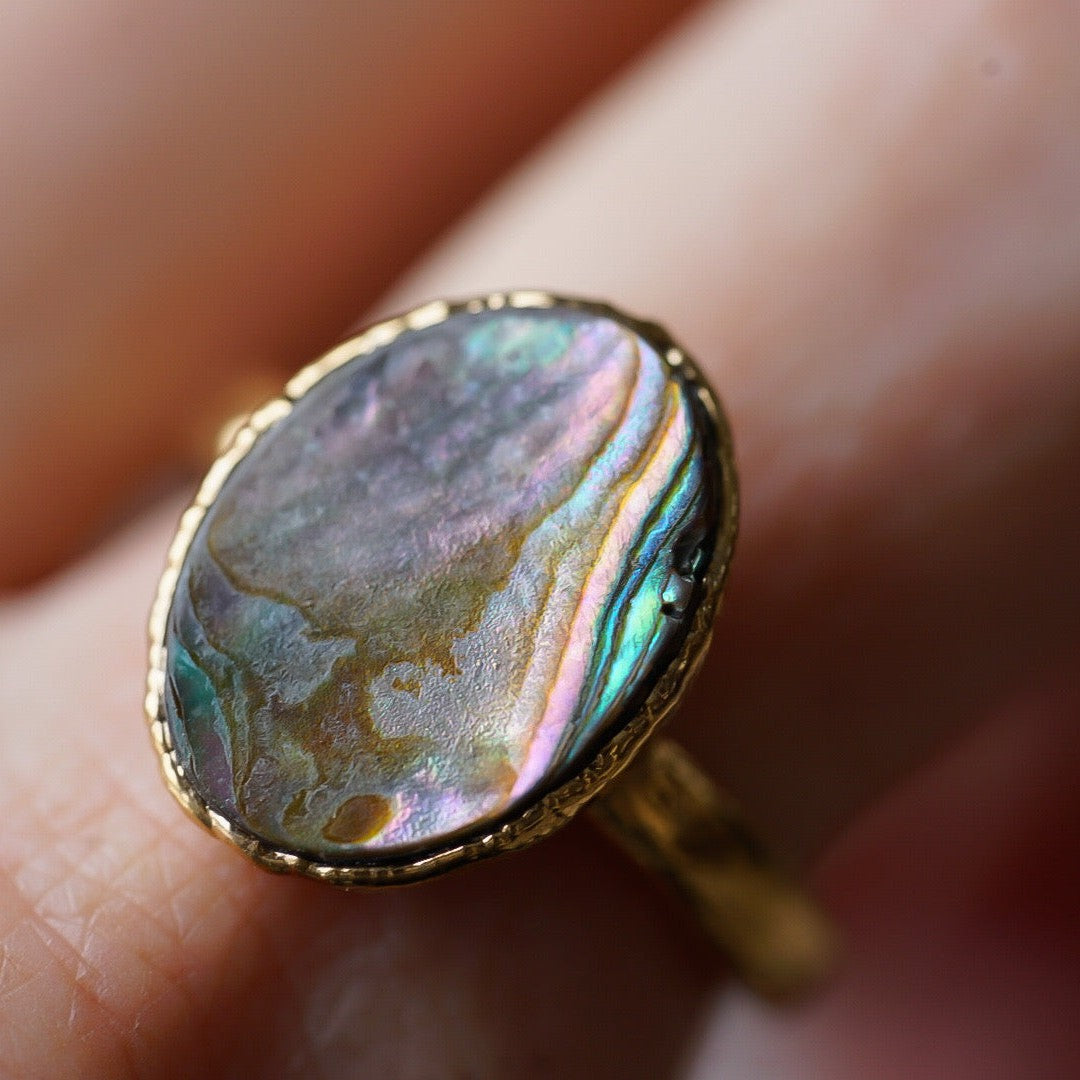 The Abalone Shell Ring is here! These are hand-crafted with a small slice of Abalone Shell. No two stones are the same so yours will be unique and one of a kind. Looks beautiful by itself or even more gorgeous layered in between one or a few of our simple stacking bands. You'll have people coming out of the wood works to admire its beauty no matter how you decide to wear it.