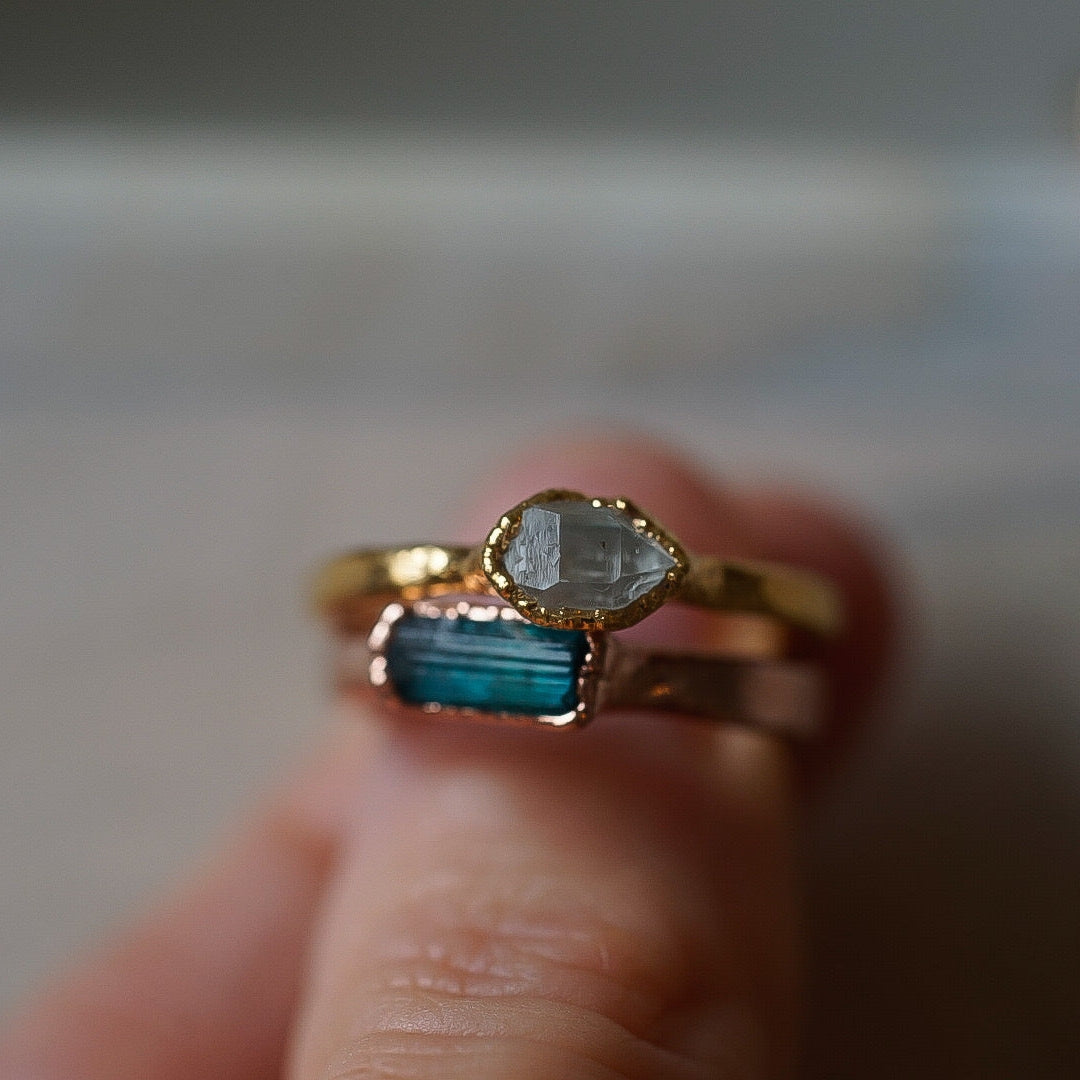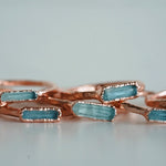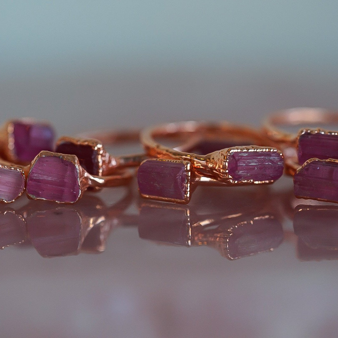 Each stone ring is made using a unique process called electroforming. We take a simple hammered copper band (or sterling silver band with the solid silver core option) and transform it into a one of a kind piece that is sure to catch the eyes and capture the hearts of everyone that sees it. We take special care in hand selecting and placing each stone on the band. This is the most critical step because it determines the final design of the ring. The ring is then placed in a solution for up to 14 hours while the metal (pure copper or pure silver depending on which option you choose) builds up and forms all around the stones. We are constantly checking on them to be sure they are forming exactly as they should be. This is so exciting to watch because each one forms in its own unique way. They are then tumbled to perfection and plated with the thickest and highest quality plating possible. This process is similar to the electroforming process. When the plating is complete, they are sealed and then sealed again to make sure they will stay as good as new with everyday wear. See our Care Instructions on how to keep your precious gems in tip top shape.