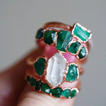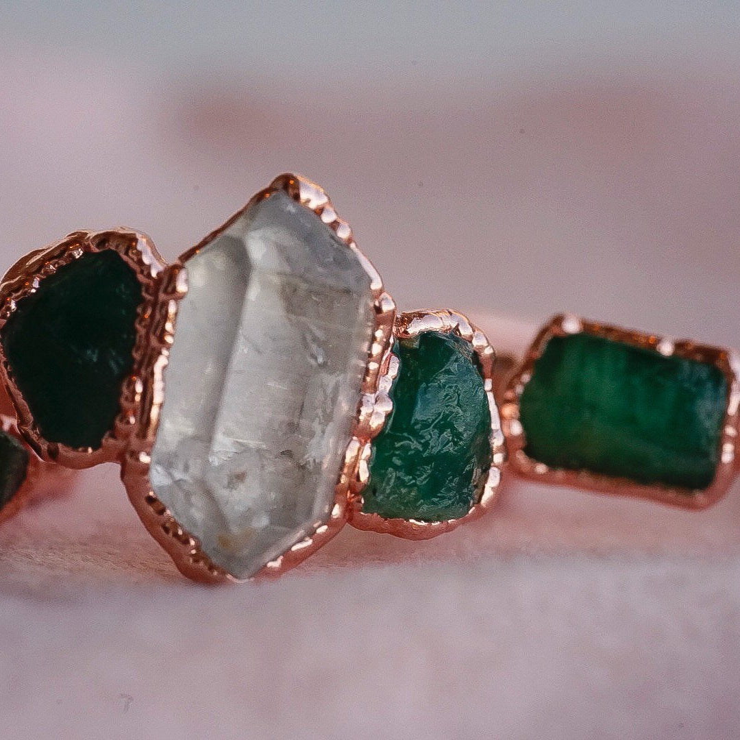 The Emerald Collection has finally arrived and whether or not you're a May baby, I'm sure you've admired it's beauty. Emerald has long been a symbol of protection, love, and wisdom. Ancient Romans went as far as to dedicate the stone to Venus, the goddess of love & beauty. With it's mesmerizing deep emerald green color, It is sure a stone that stands out in the crowd. This piece is adorned with a Diamond Quartz stone in the center and a high quaility Emerald stone on each side. Looks beautiful paired with other pieces in the collection, add on bands, your own sentimental pieces, or all by itself.