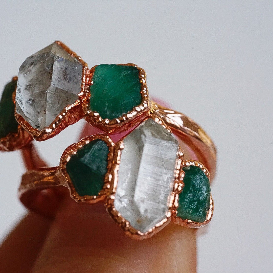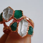 Each stone ring is made using a unique process called electroforming. We take a simple hammered copper band (or sterling silver band with the solid silver core option) and transform it into a one of a kind piece that is sure to catch the eyes and capture the hearts of everyone that sees it. We take special care in hand selecting and placing each stone on the band. This is the most critical step because it determines the final design of the ring. The ring is then placed in a solution for up to 14 hours while the metal (pure copper or pure silver depending on which option you choose) builds up and forms all around the stones. We are constantly checking on them to be sure they are forming exactly as they should be. This is so exciting to watch because each one forms in its own unique way. They are then tumbled to perfection and plated with the thickest and highest quality plating possible. This process is similar to the electroforming process. When the plating is complete, they are sealed and then sealed again to make sure they will stay as good as new with everyday wear. See our Care Instructions on how to keep your precious gems in tip top shape.