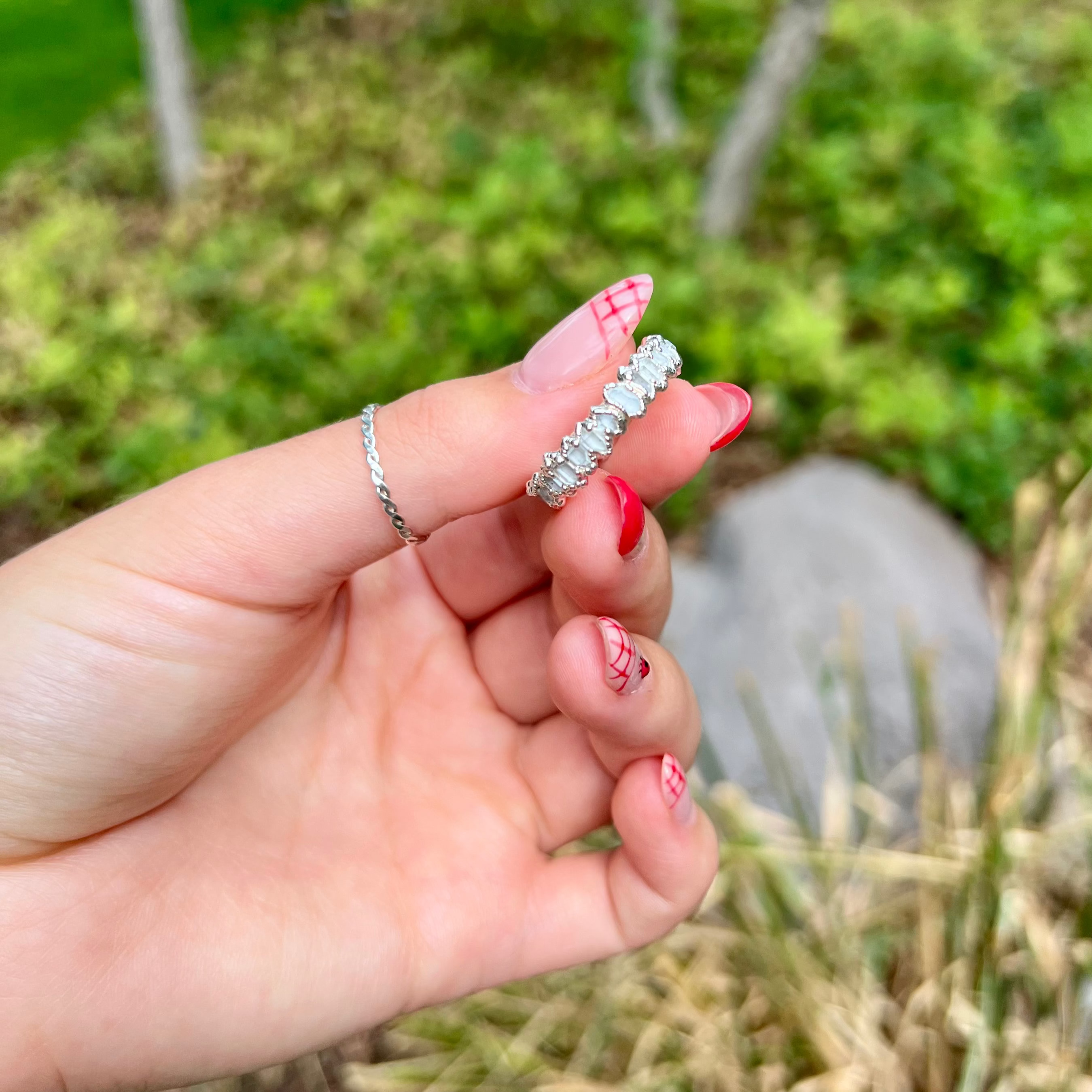 The newest addition to our Lovebird Collection is here and it has been one of our most requested pieces. Sooooo much time goes into each one of these pieces. The Eternity Ring is adorned with several high quality Diamond Quartz stones from either Pakistan or the Herkimer Mines in New York. The stones wrap all the way around the band. Looks beautiful paired with other pieces in the Lovebird collection, add on bands, your own sentimental pieces, or all by itself.