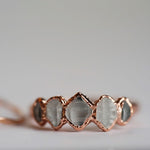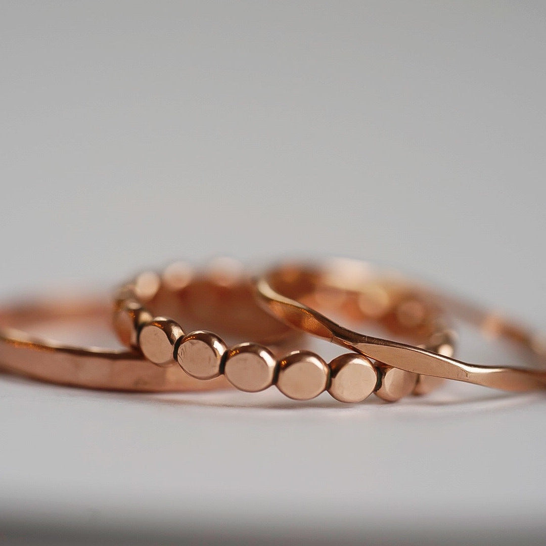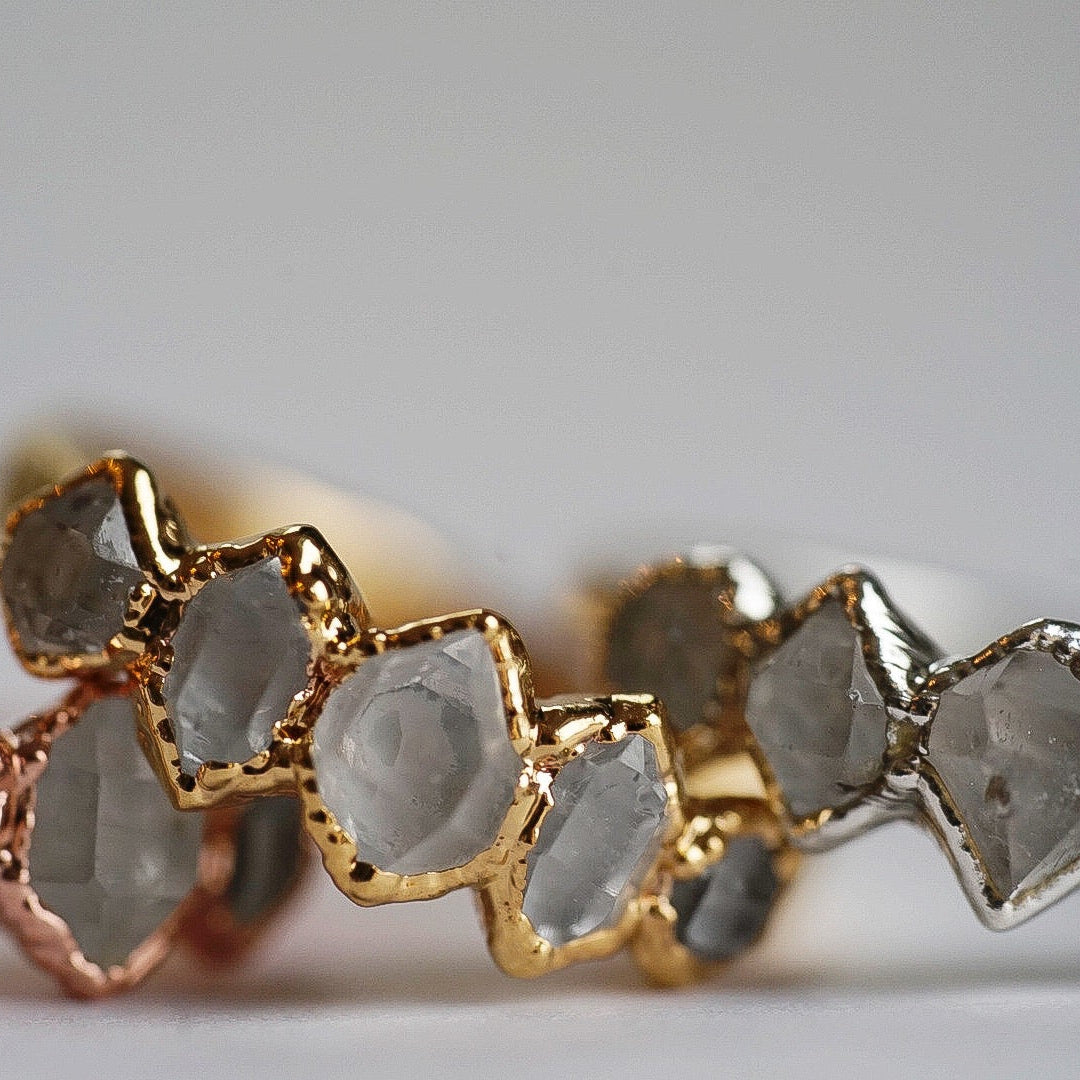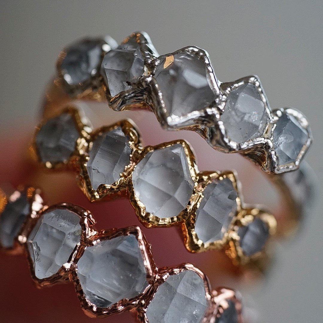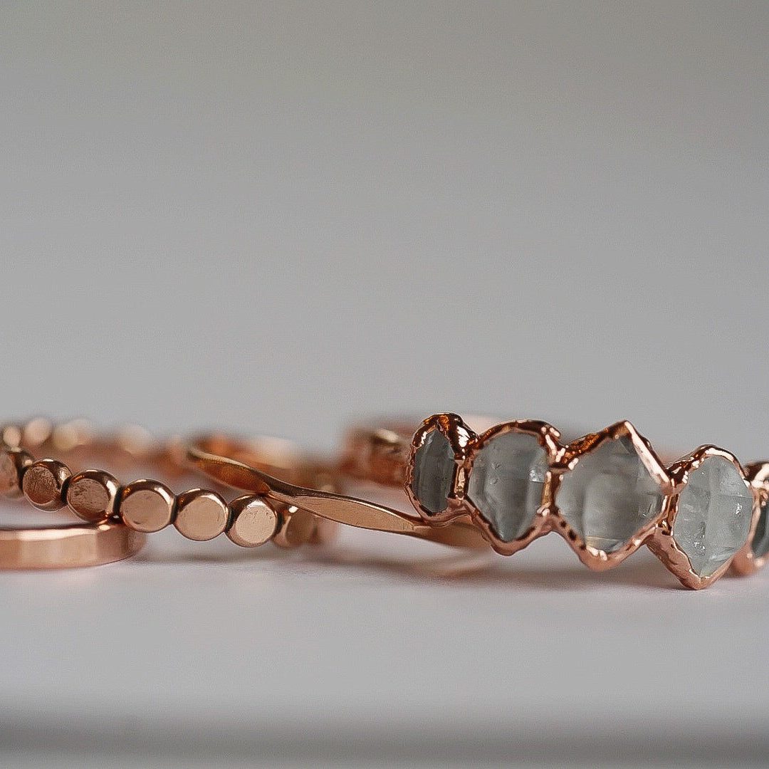 Each stone ring is made using a unique process called electroforming. We take a simple hammered copper band (or sterling silver band with the solid silver core option) and transform it into a one of a kind piece that is sure to catch the eyes and capture the hearts of everyone that sees it. We take special care in hand selecting and placing each stone on the band. This is the most critical step because it determines the final design of the ring. The ring is then placed in a solution for up to 14 hours while the metal (pure copper or pure silver depending on which option you choose) builds up and forms all around the stones. We are constantly checking on them to be sure they are forming exactly as they should be. This is so exciting to watch because each one forms in its own unique way. They are then tumbled to perfection and plated with the thickest and highest quality plating possible. This process is similar to the electroforming process. When the plating is complete, they are sealed and then sealed again to make sure they will stay as good as new with everyday wear. See our Care Instructions on how to keep your precious gems in tip top shape.