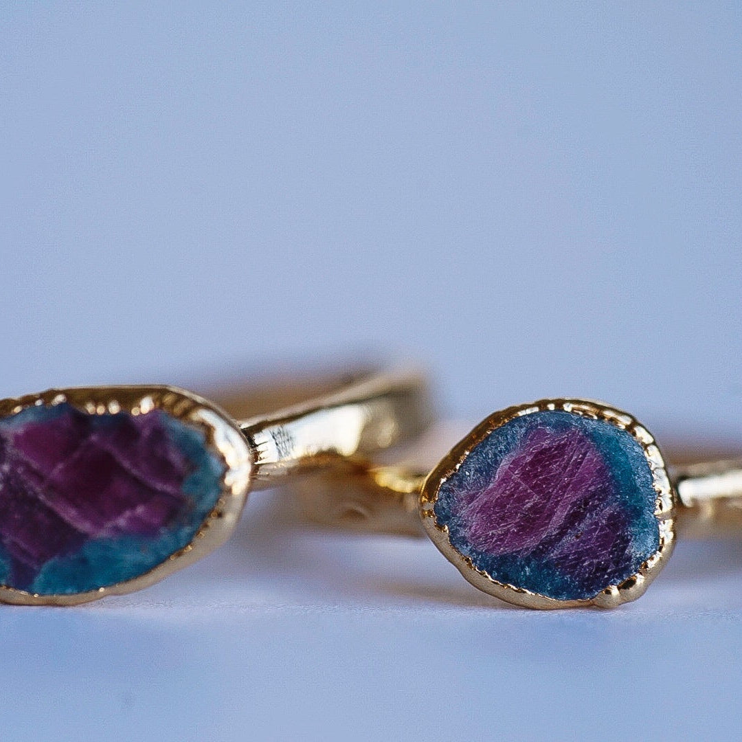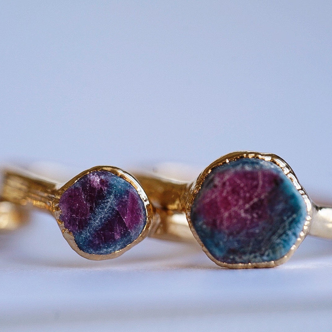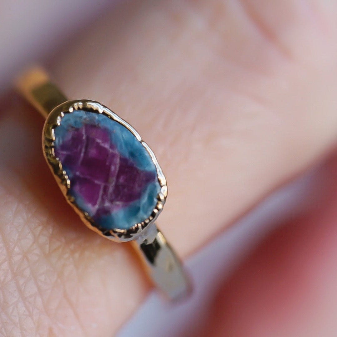The Zoisite Ruby Ring is here! These are hand-crafted with a small slice of raw Zoisite Ruby. They are a mixed color with the most gorgeous blue/green and pink shades. No two stones are the same so yours will be unique and one of a kind. Looks beautiful by itself or even more gorgeous layered in between one or a few of our simple stacking bands. You'll have people coming out of the wood works to admire its beauty no matter how you decide to wear it.