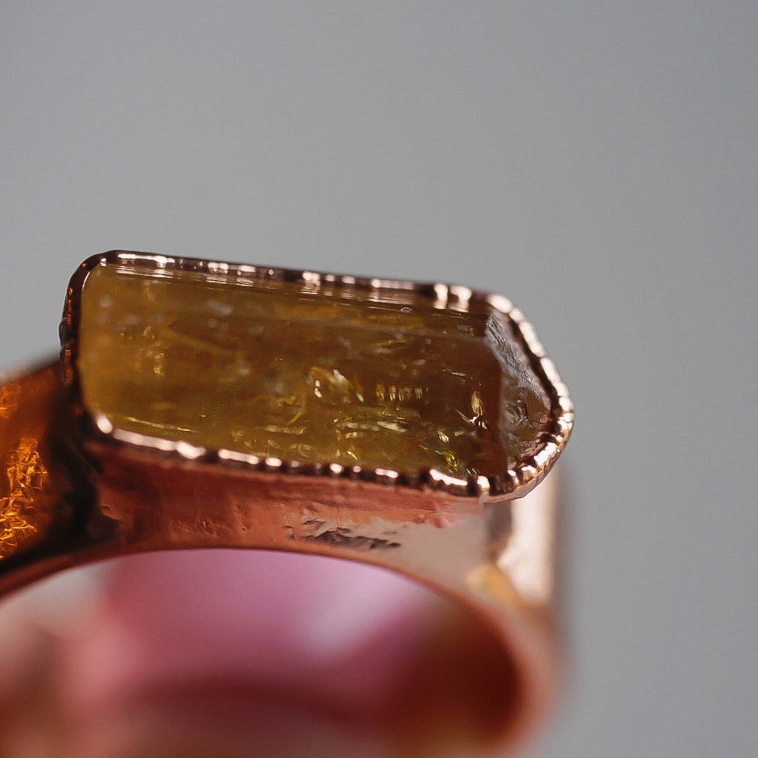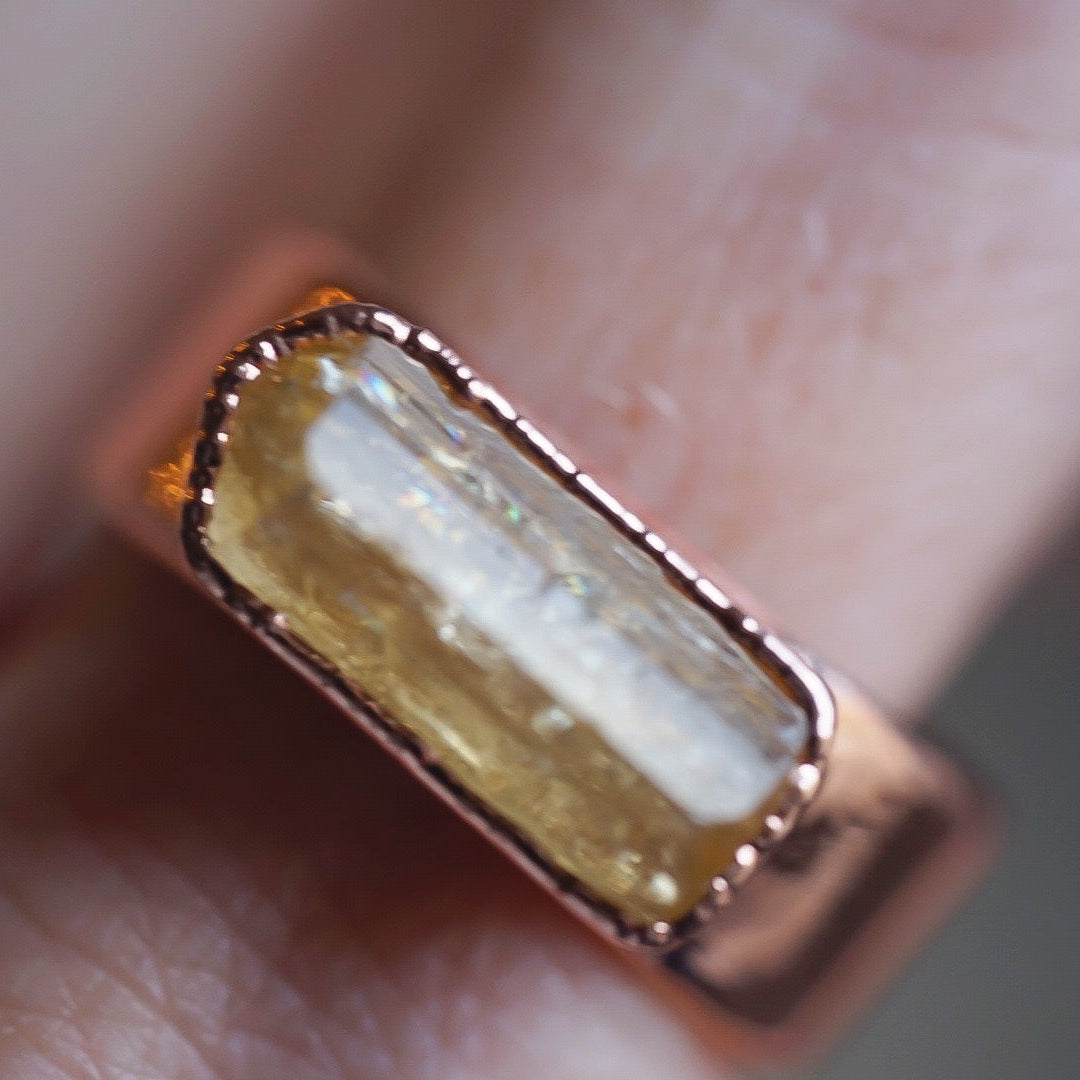The Imperial Topaz Thick Band Ring is adorned with a high quality Imperial Topaz stone and set on a handmade thick band. We attach the stone with a unique process called electroforming. Our thick band rings are meant to be more of a statement piece. Looks beautiful by itself or even more gorgeous layered in between one of our simple stacking bands.