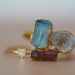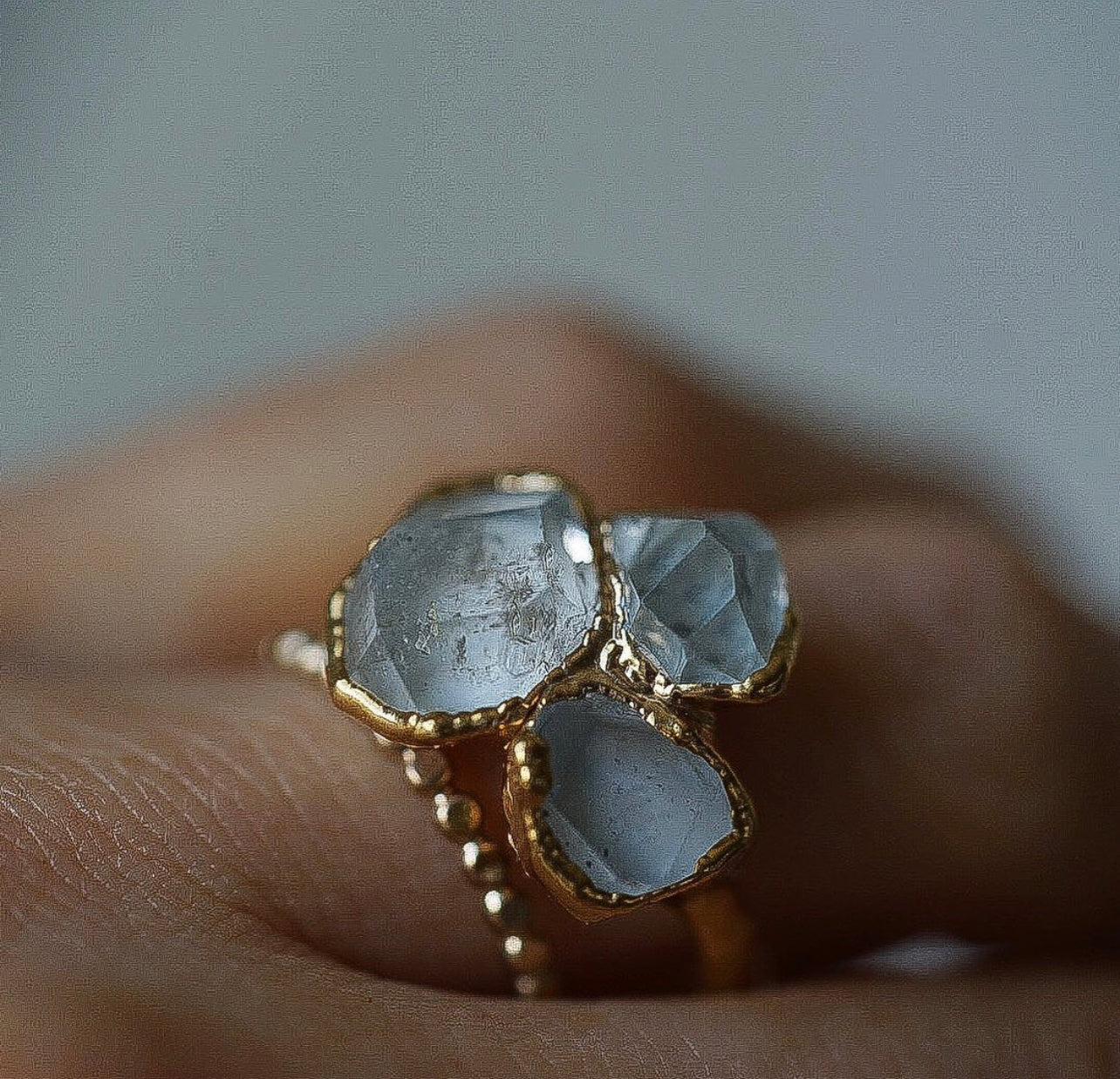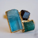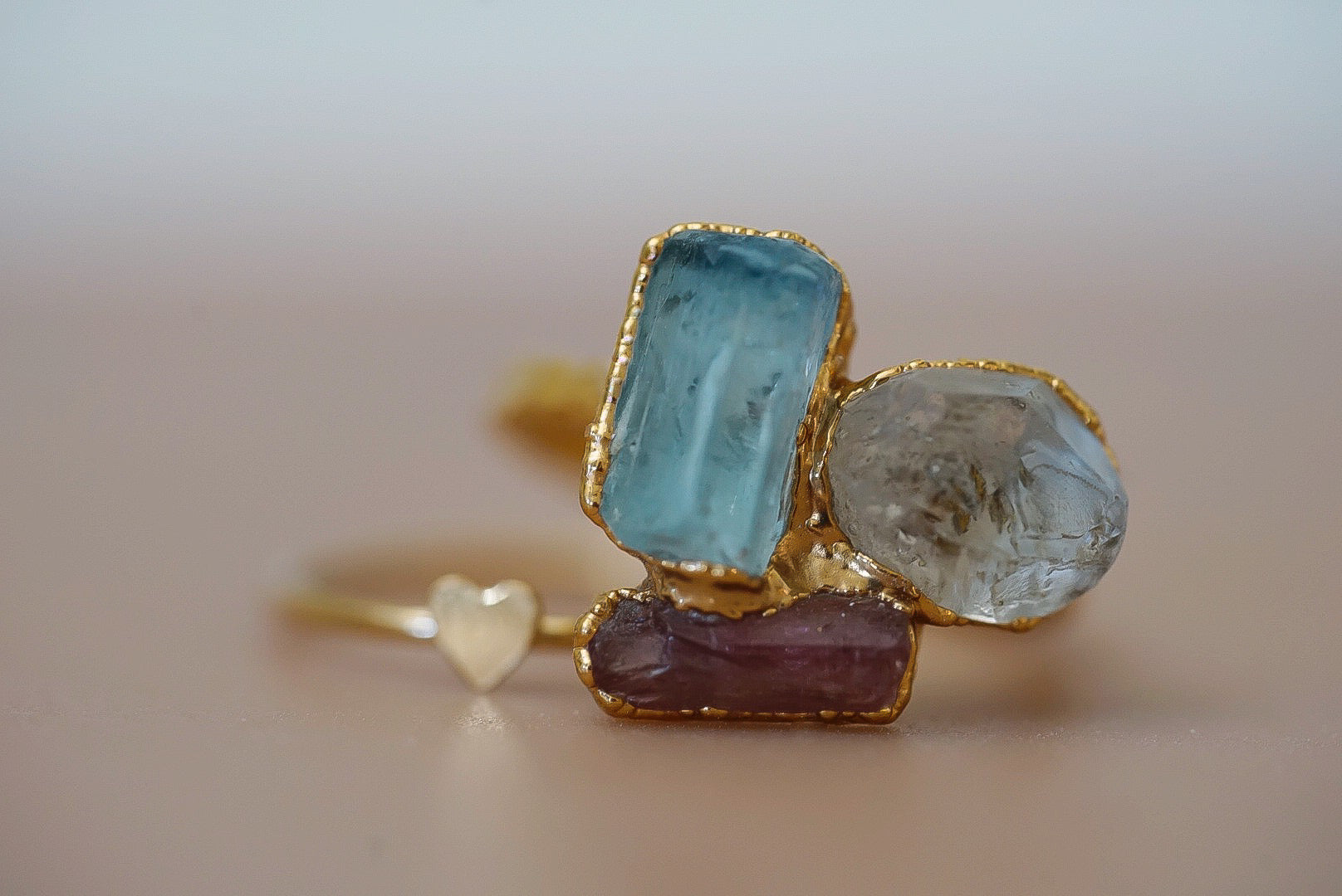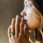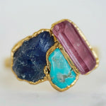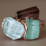 Each stone ring is made using a unique process called electroforming. We take a simple hammered copper band (or sterling silver band with the solid silver core option) and transform it into a one of a kind piece that is sure to catch the eyes and capture the hearts of everyone that sees it. We take special care in hand selecting and placing each stone on the band. This is the most critical step because it determines the final design of the ring. The ring is then placed in a solution for up to 14 hours while the metal (pure copper or pure silver depending on which option you choose) builds up and forms all around the stones. We are constantly checking on them to be sure they are forming exactly as they should be. This is so exciting to watch because each one forms in its own unique way. They are then tumbled to perfection and plated with the thickest and highest quality plating possible. This process is similar to the electroforming process. When the plating is complete, they are sealed and then sealed again to make sure they will stay as good as new with everyday wear. See our Care Instructions on how to keep your precious gems in tip top shape.