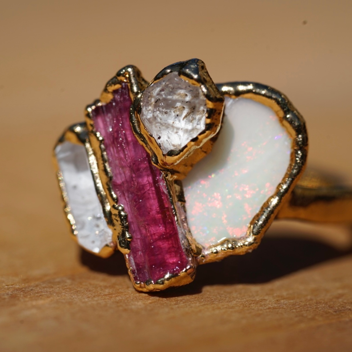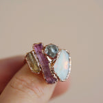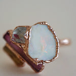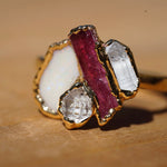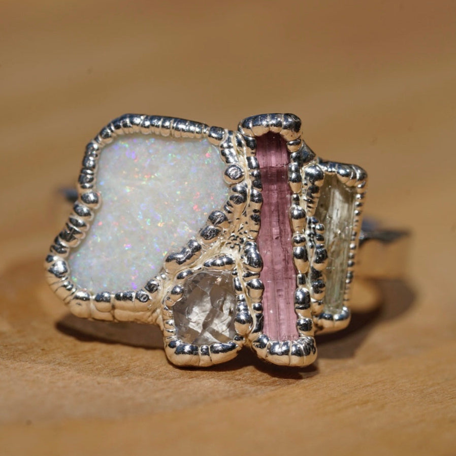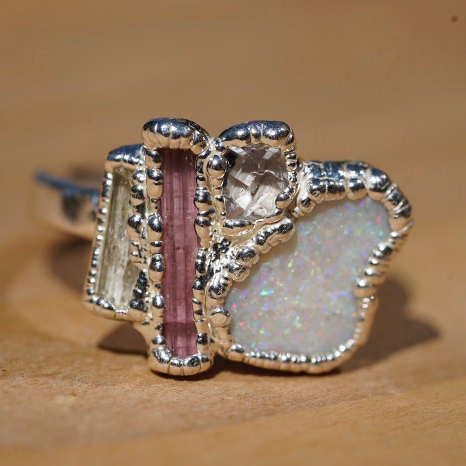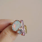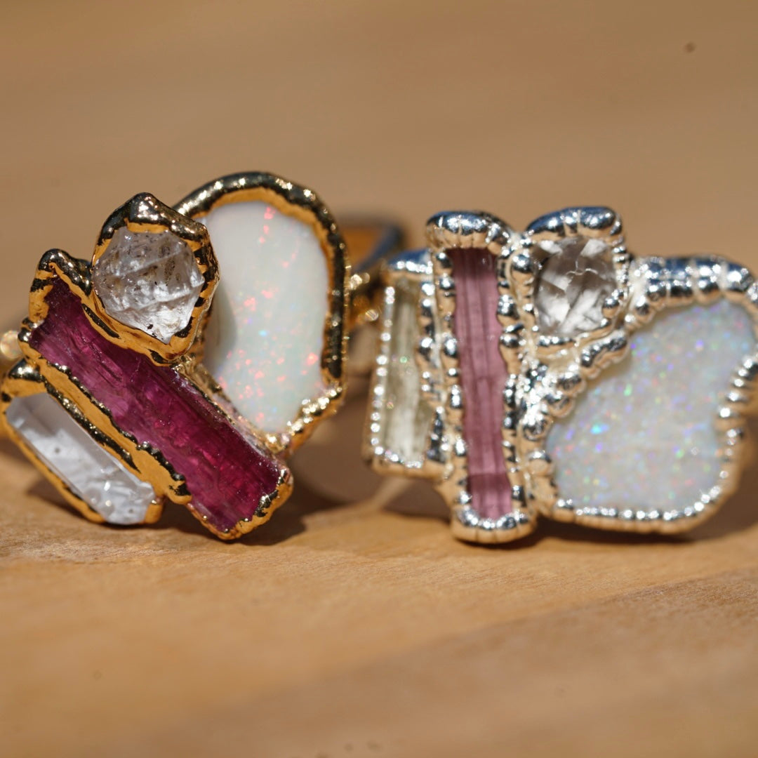 We chose the name Lotus because the stones evoke the beauty and symbolism of the Lotus flower. Our original Lotus piece features high-quality Pink Tourmaline, Opal, and Imperial Topaz, accented with a smaller Diamond Quarz that represents purity—just like the flower itself.