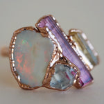 Each stone ring is made using a unique process called electroforming. We take a simple hammered copper band (or sterling silver band with the solid silver core option) and transform it into a one of a kind piece that is sure to catch the eyes and capture the hearts of everyone that sees it. We take special care in hand selecting and placing each stone on the band. This is the most critical step because it determines the final design of the ring. The ring is then placed in a solution for up to 14 hours while the metal (pure copper or pure silver depending on which option you choose) builds up and forms all around the stones. We are constantly checking on them to be sure they are forming exactly as they should be. This is so exciting to watch because each one forms in its own unique way. They are then tumbled to perfection and plated with the thickest and highest quality plating possible. This process is similar to the electroforming process. When the plating is complete, they are sealed and then sealed again to make sure they will stay as good as new with everyday wear. See our Care Instructions on how to keep your precious gems in tip top shape.