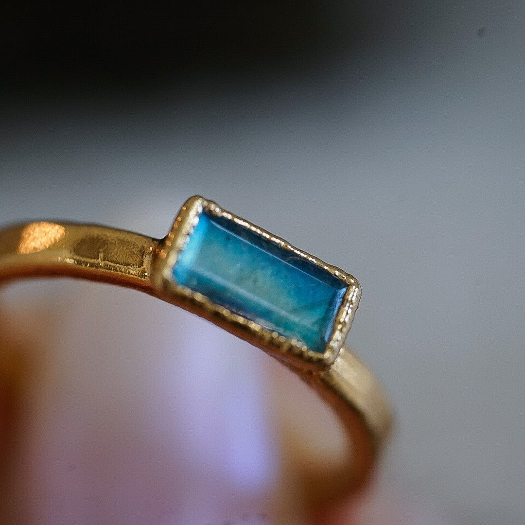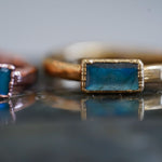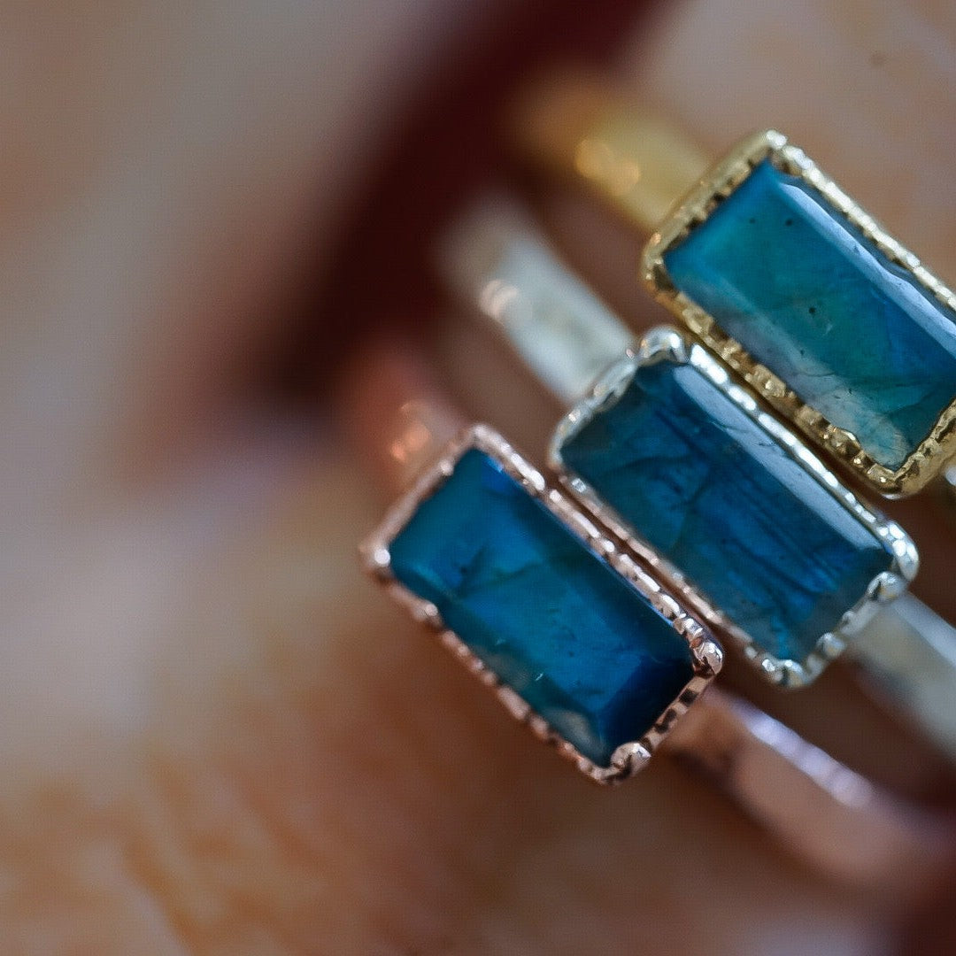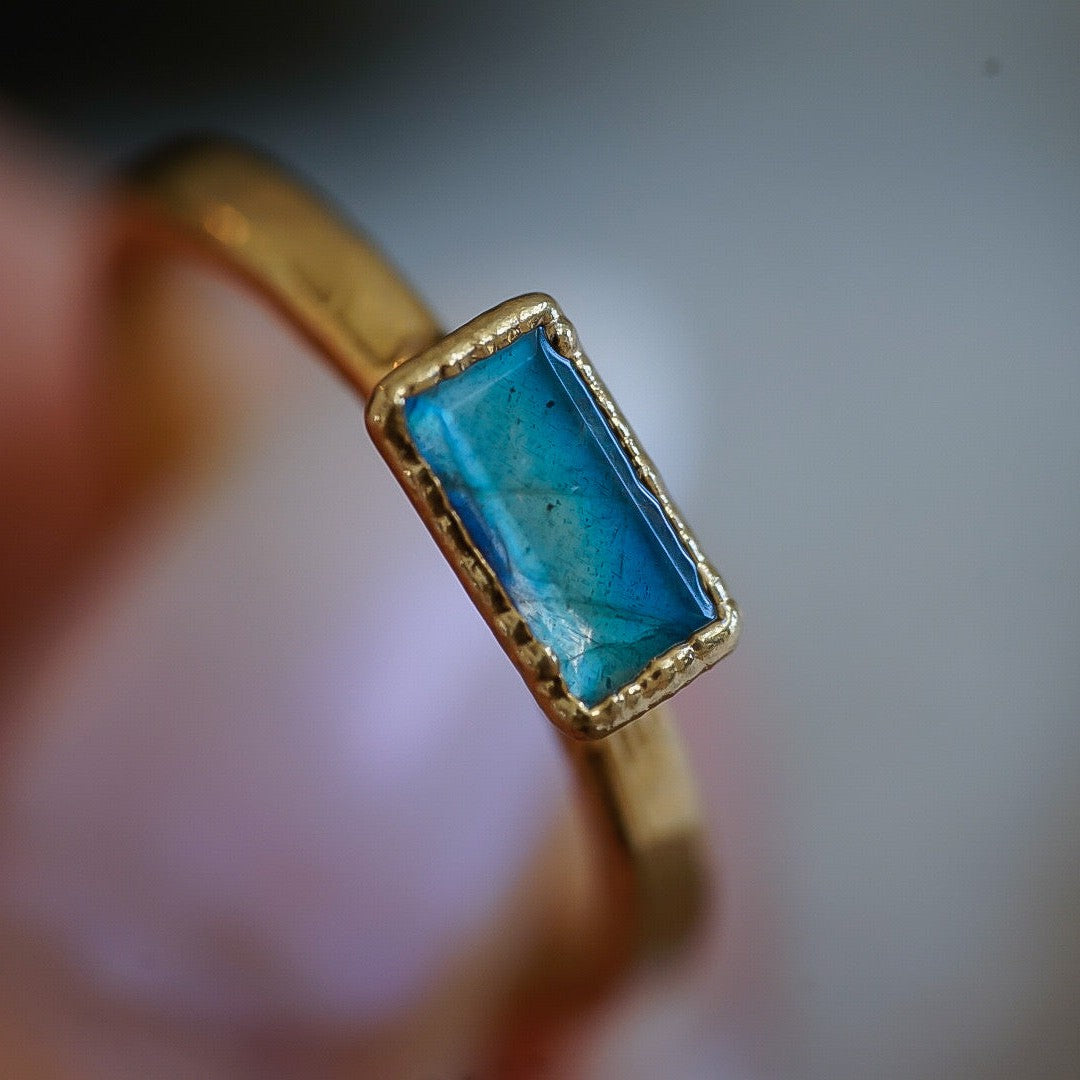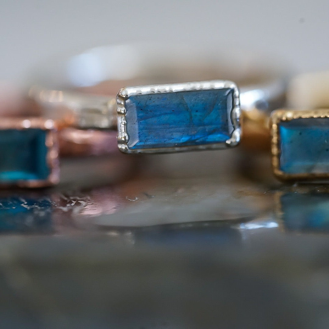 The Labradorite Minimalist Ring is adorned with a single semi-faceted Labradorite stone set on a simple hammered band in the metal of your choice. Our minimalist style rings are more dainty and more delicate than our regular single stone rings. Looks beautiful by itself or even more gorgeous layered in between one or a few of our stacking bands.