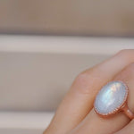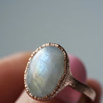 People love Moonstone because of its "blue flash". It looks plain white in some lighting and you get glimpses of a gorgeous iridescent rainbow in certain lighting. Each stone is unique and no two are exactly the same. This ring is handmade with a single polished, oval Moonstone. You will never want to take this beautiful piece off your finger.