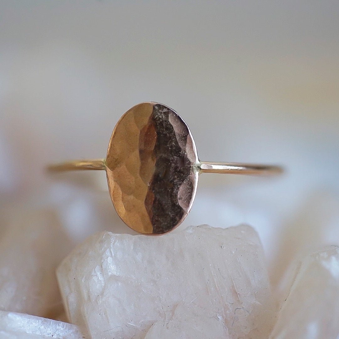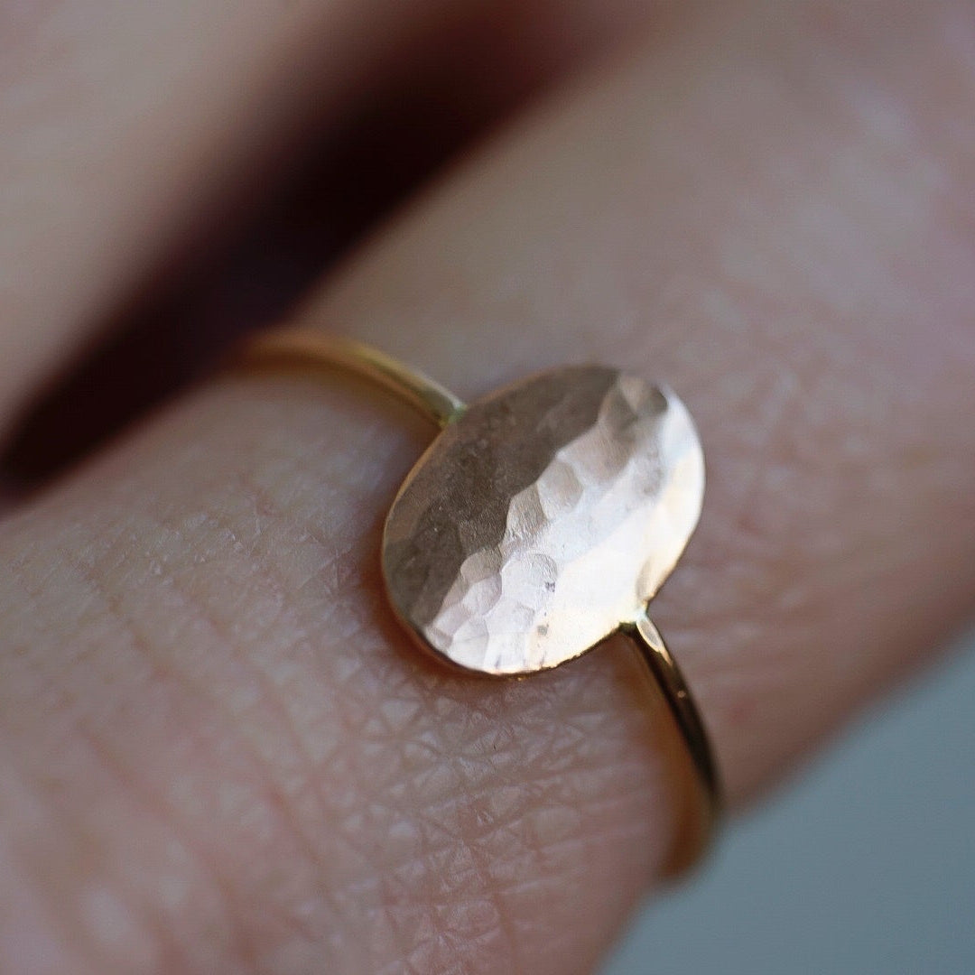 The Oval Ring is the perfect & delicate addition to any ring stack! These rings are made for mixing & matching, and adding extra thickness & sparkle. Each ring is individually cut, soldered, and polished for a beautiful hand-crafted, high-quality ring. It is also hammered for a added shine and texture.- The oval is 7x10mm and the band is just under 1mm