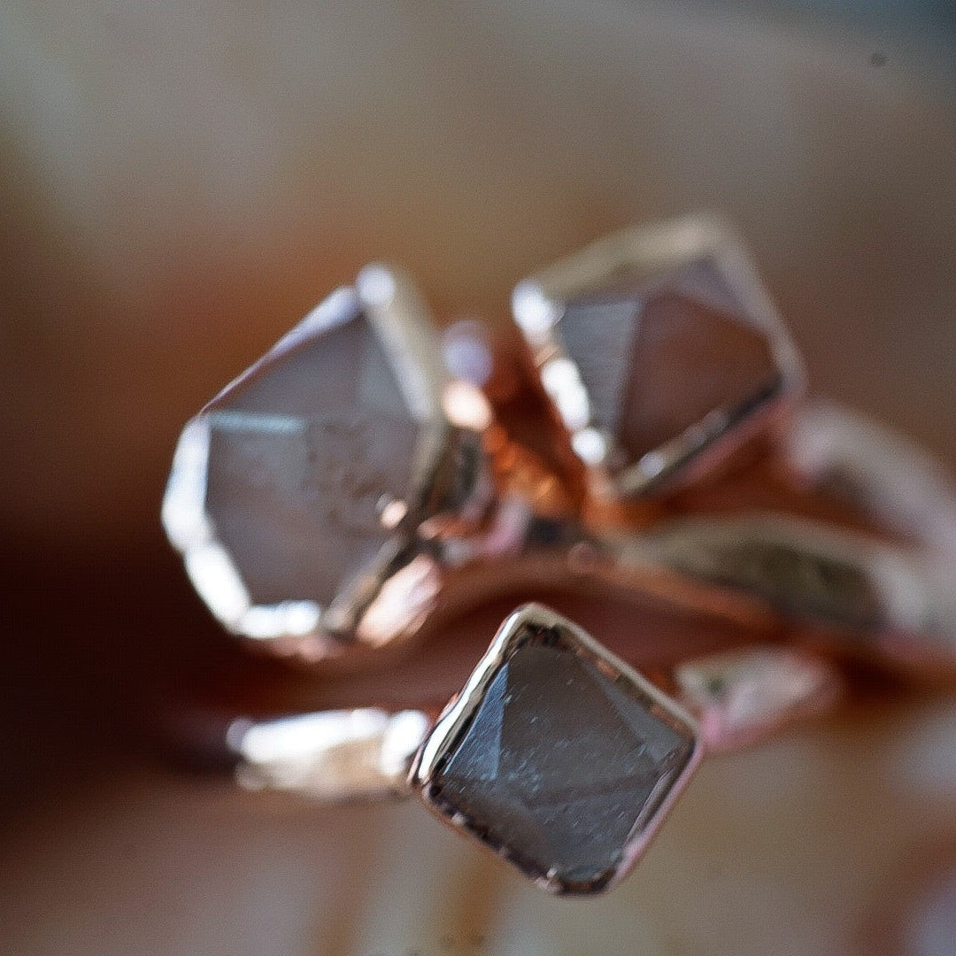 Each stone ring is made using a unique process called electroforming. We take a simple hammered copper band (or sterling silver band with the solid silver core option) and transform it into a one of a kind piece that is sure to catch the eyes and capture the hearts of everyone that sees it. We take special care in hand selecting and placing each stone on the band. This is the most critical step because it determines the final design of the ring. The ring is then placed in a solution for up to 14 hours while the metal (pure copper or pure silver depending on which option you choose) builds up and forms all around the stones. We are constantly checking on them to be sure they are forming exactly as they should be. This is so exciting to watch because each one forms in its own unique way. They are then tumbled to perfection and plated with the thickest and highest quality plating possible. This process is similar to the electroforming process. When the plating is complete, they are sealed and then sealed again to make sure they will stay as good as new with everyday wear. See our Care Instructions on how to keep your precious gems in tip top shape.