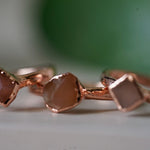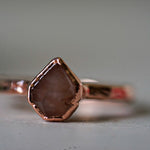 We were able to get our hands on this amazing stone called Beta Quartz! It looks like a matte Diamond Quartz in a variety of shades of peach and pinks! The Peachy Pink Quartz Minimalist Ring is adorned with a single, small Beta Quartz stone set on a simple hammered band in the metal of your choice. Our minimalist style rings are more dainty and more delicate than our regular single stone rings. Looks beautiful by itself or even more gorgeous layered in between one or a few of our simple stacking bands.