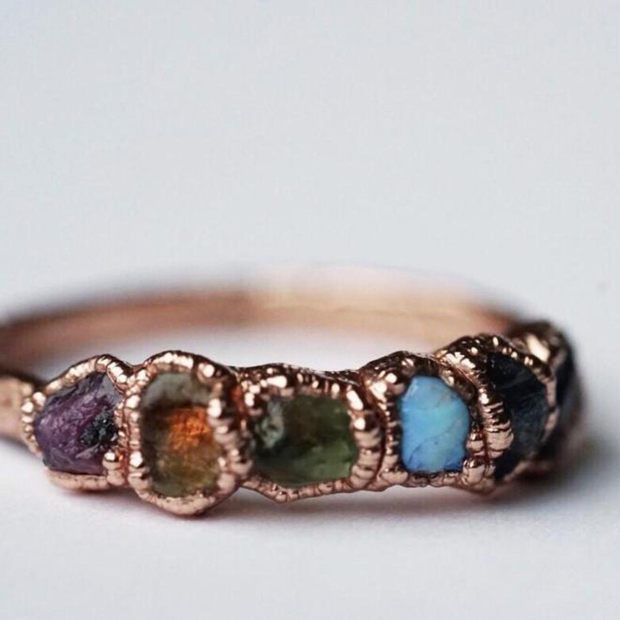 Each stone ring is made using a unique process called electroforming. We take a simple hammered copper band and transform it into a one of a kind piece that is sure to catch the eyes and capture the hearts of everyone that sees it. We take special care in hand selecting and placing each stone on the band. This is the most critical step because it determines the final design of the ring. The ring is then placed in a solution for up to 14 hours while the metal builds up and forms all around the stones. We are constantly checking on them to be sure they are forming exactly as they should be. This is so exciting to watch because each one forms in its own unique way. They are then tumbled to perfection and plated with the thickest and highest quality plating possible. This process is similar to the electroforming process. When the plating is complete, they are sealed and then sealed again to make sure they will stay as good as new with everyday wear. See our Care Instructions on how to keep your precious gems in tip top shape.