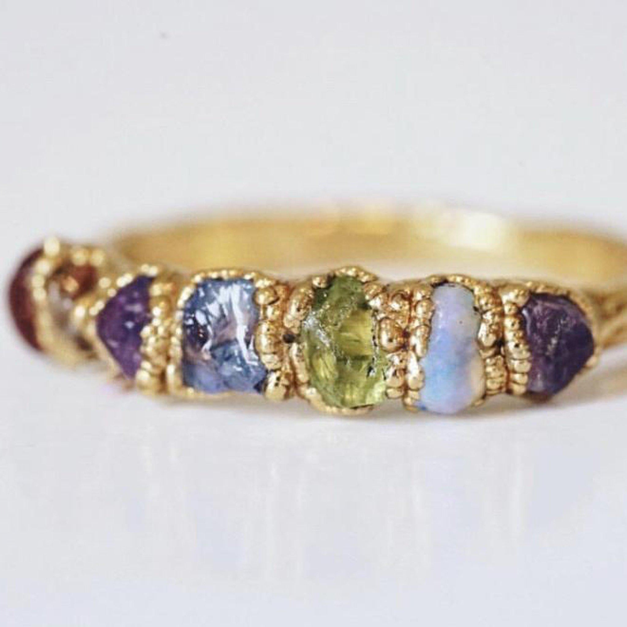 The Rainbow Ring is adorned with 7 small gemstones in all the colors of the rainbow! They are aligned in a row on a simple hammered band. Whether you want something special to represent your sweet Rainbow Baby, to wear something to help align & balance your Chakra's, or just simply love rainbows, you can't go wrong with this piece. Looks beautiful by itself or even more gorgeous layered in between one or three of our simple stacking bands. It's sure to make you happy every time you wear it!