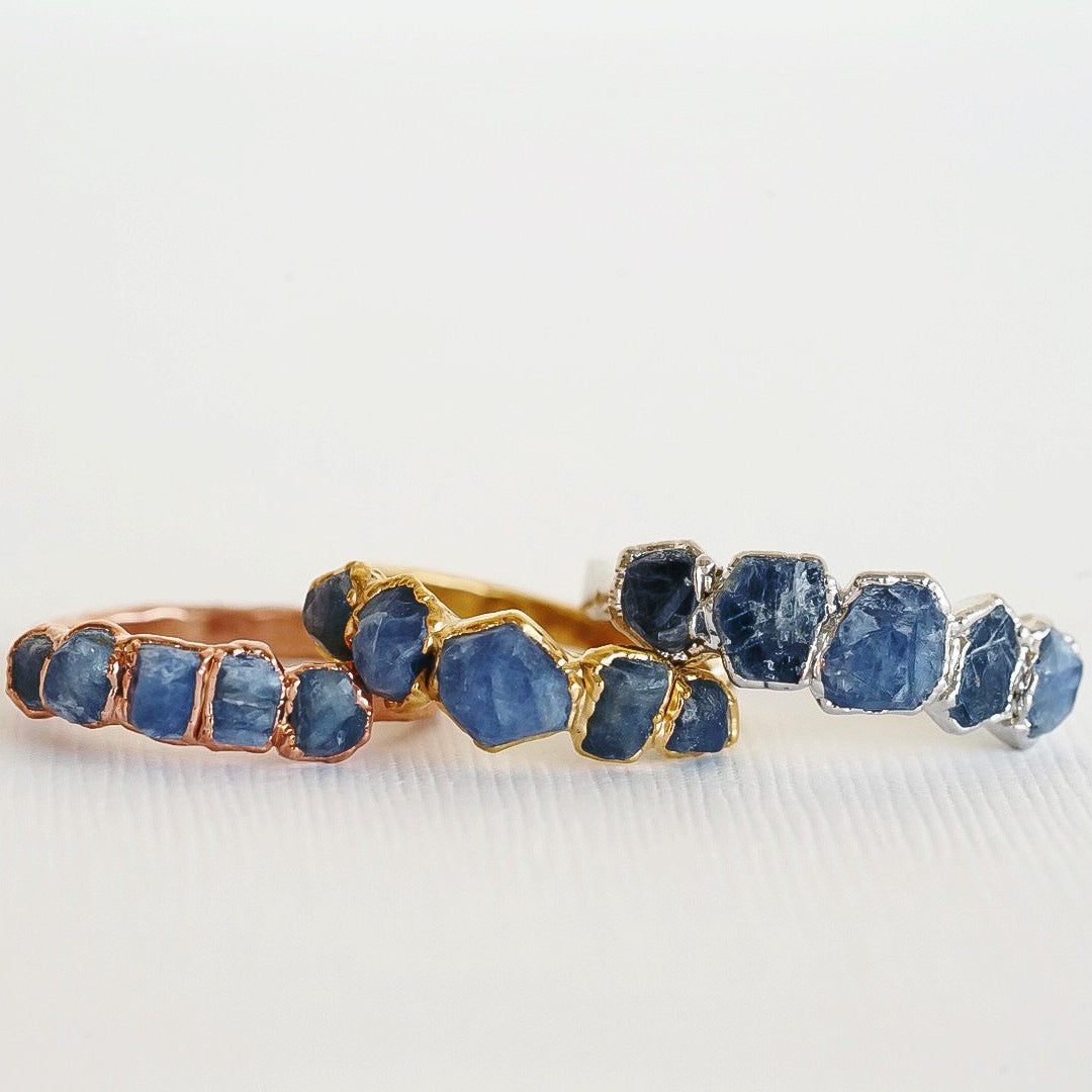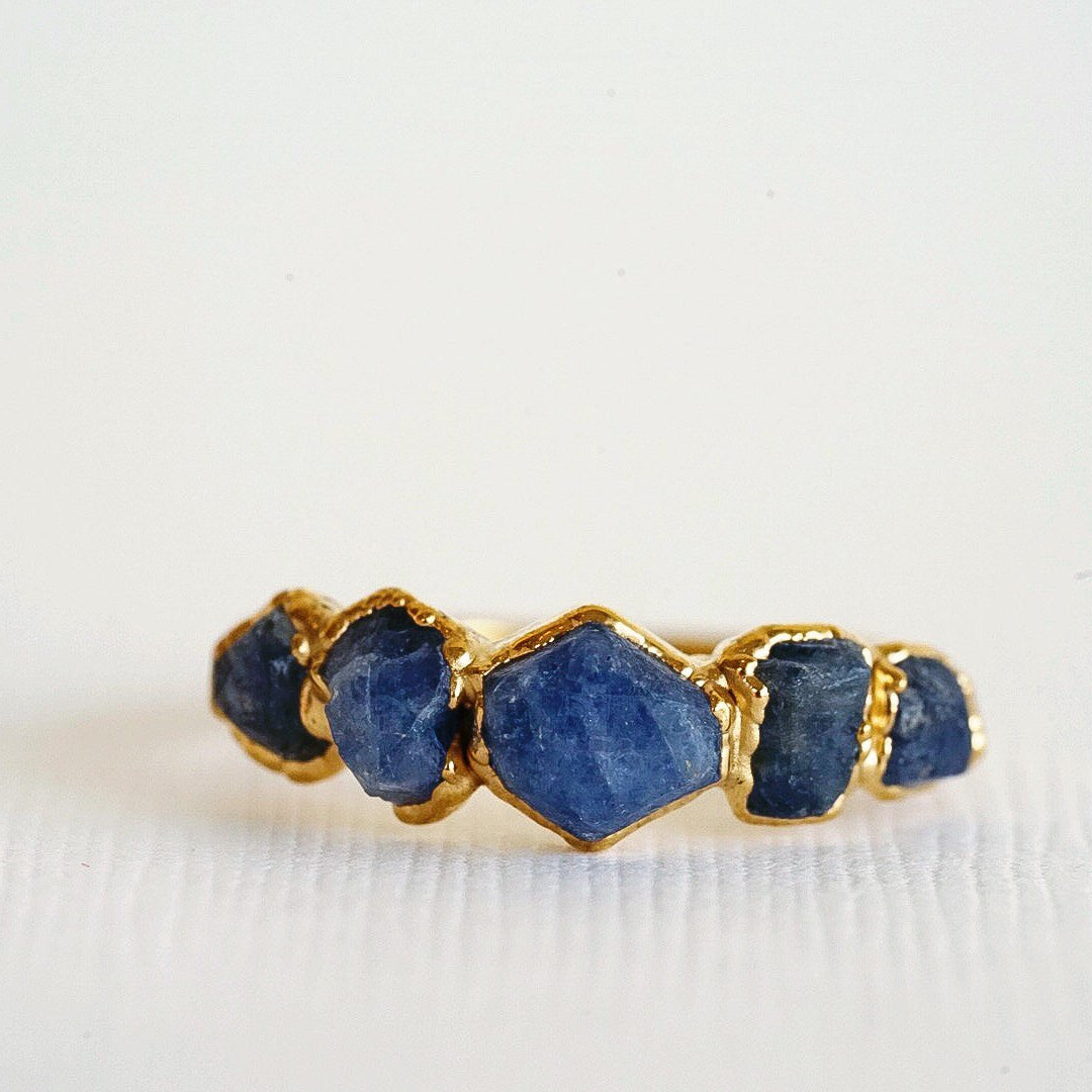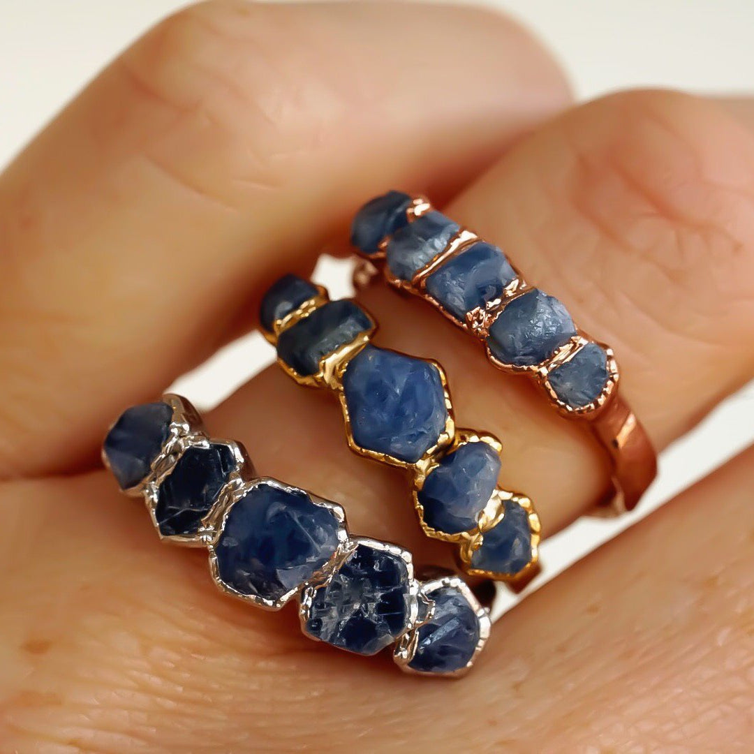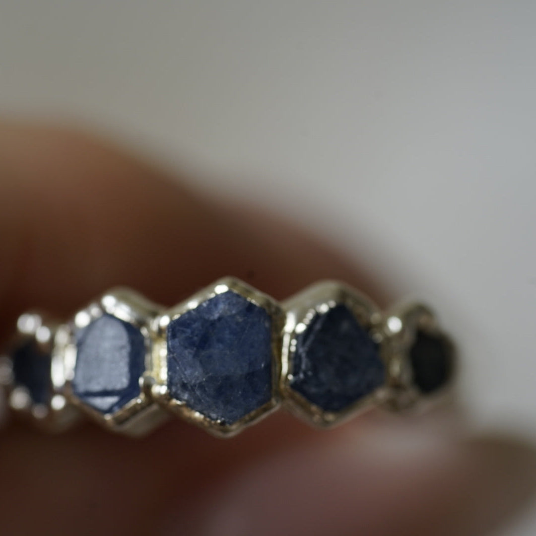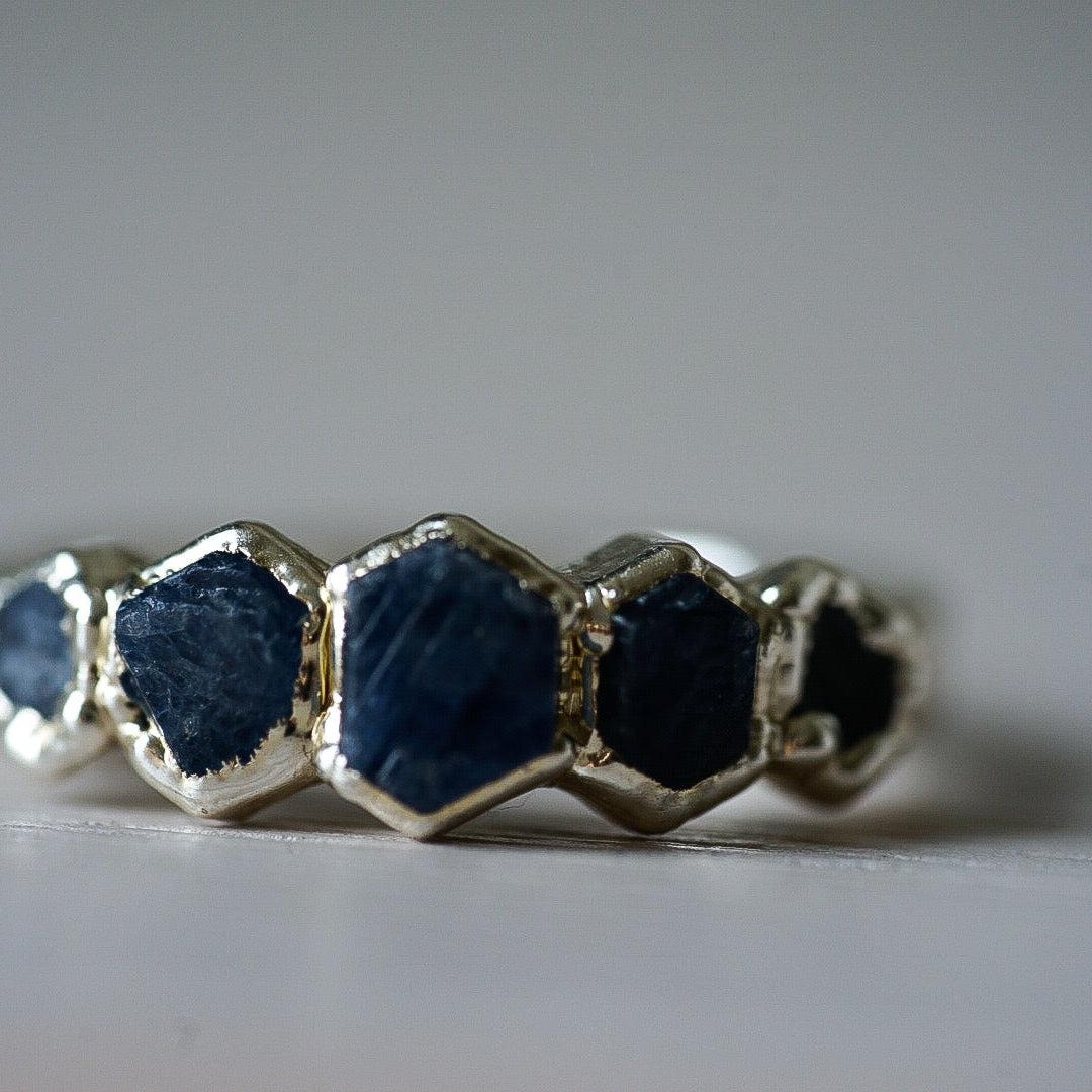 The Sapphire Multi Stone Ring is adorned with five deep blue small Sapphire stones aligned in a row on top of a simple hammered band. Looks beautiful by itself or even more gorgeous layered in between one or three of our simple stacking bands. You'll have people coming out of the wood works to admire its beauty no matter how you decide to wear it.
