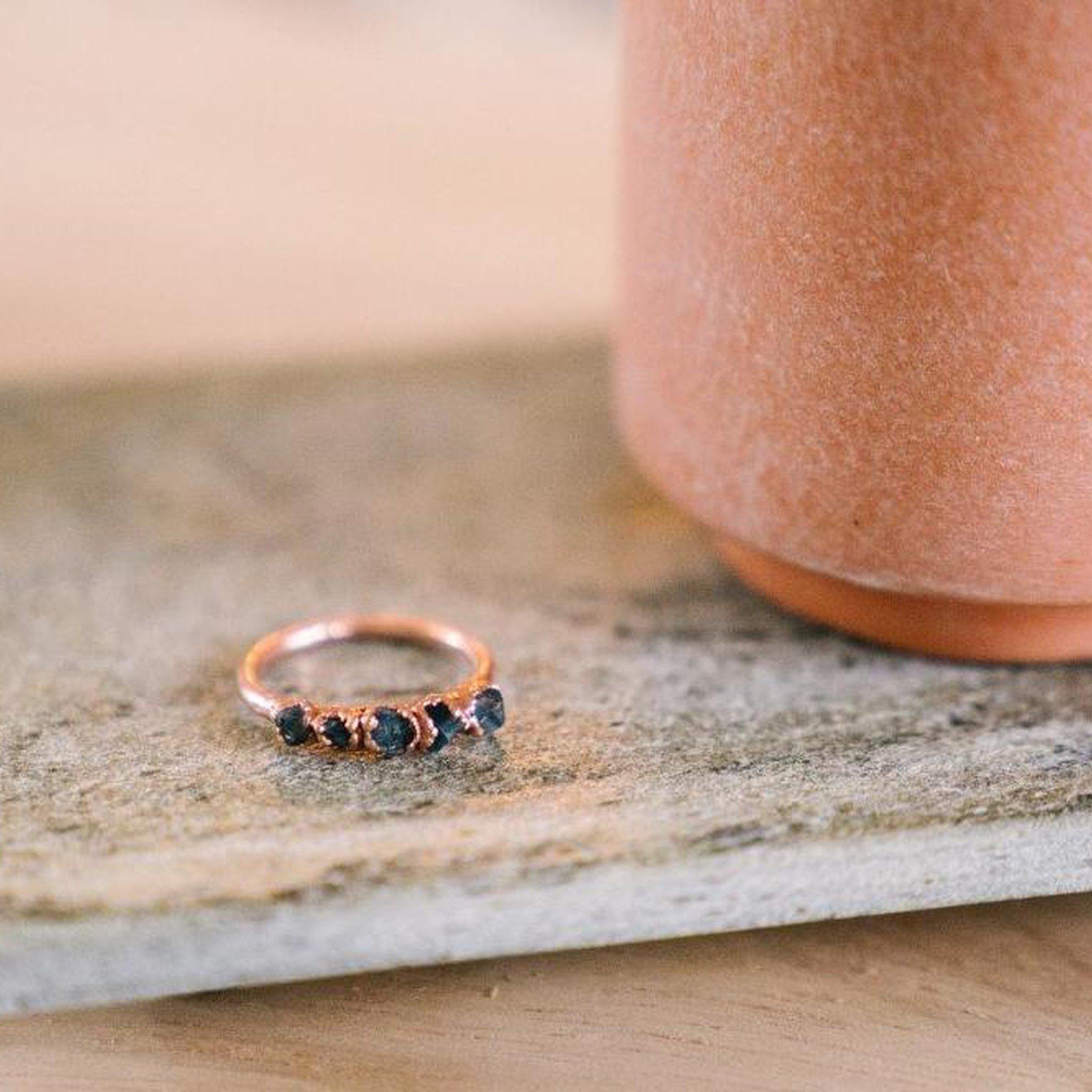 Each stone ring is made using a unique process called electroforming. We take a simple hammered copper band and transform it into a one of a kind piece that is sure to catch the eyes and capture the hearts of everyone that sees it. We take special care in hand selecting and placing each stone on the band. This is the most critical step because it determines the final design of the ring. The ring is then placed in a solution for up to 14 hours while the metal builds up and forms all around the stones. We are constantly checking on them to be sure they are forming exactly as they should be. This is so exciting to watch because each one forms in its own unique way. They are then tumbled to perfection and plated with the thickest and highest quality plating possible. This process is similar to the electroforming process. When the plating is complete, they are sealed and then sealed again to make sure they will stay as good as new with everyday wear. See our Care Instructions on how to keep your precious gems in tip top shape.