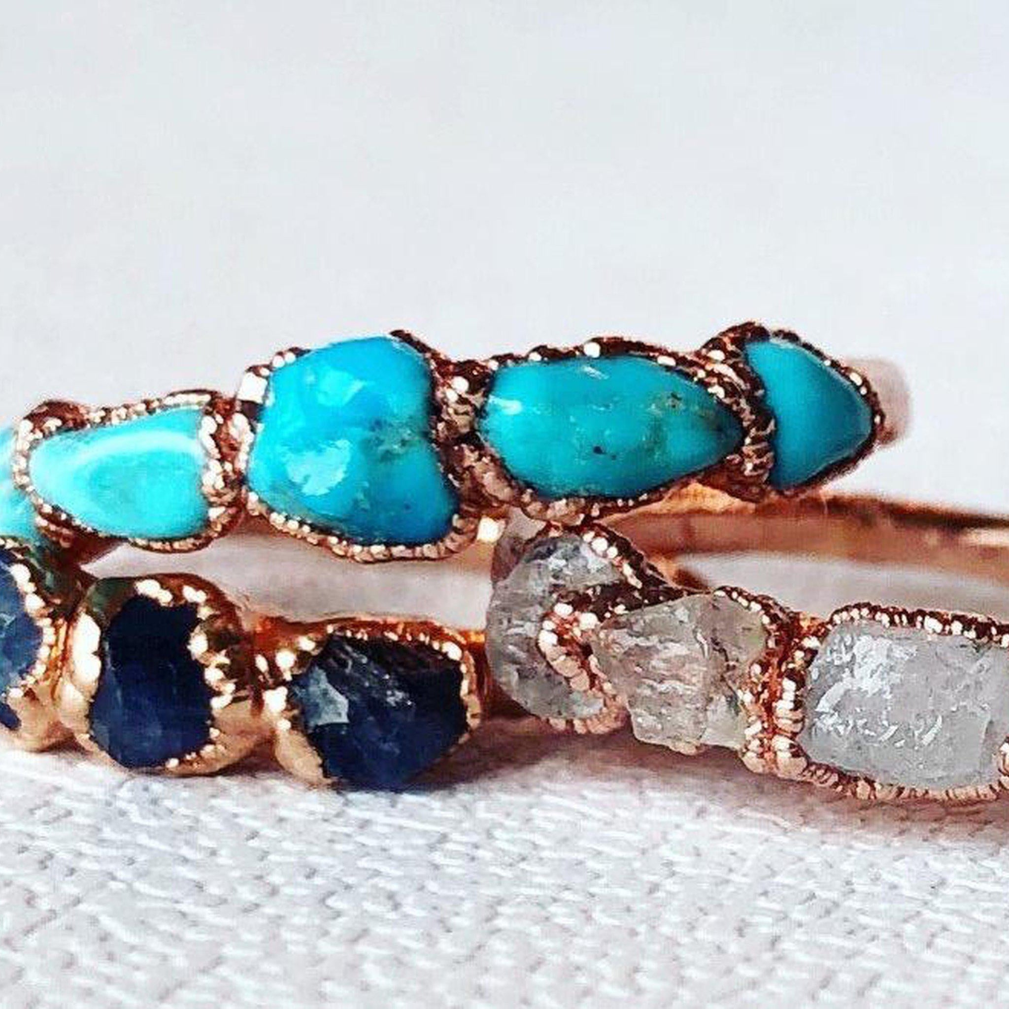 Each stone ring is made using a unique process called electroforming. We take a simple hammered copper band (or sterling silver band with the solid silver core option) and transform it into a one of a kind piece that is sure to catch the eyes and capture the hearts of everyone that sees it. We take special care in hand selecting and placing each stone on the band. This is the most critical step because it determines the final design of the ring. The ring is then placed in a solution for up to 14 hours while the metal (pure copper or pure silver depending on which option you choose) builds up and forms all around the stones. We are constantly checking on them to be sure they are forming exactly as they should be. This is so exciting to watch because each one forms in its own unique way. They are then tumbled to perfection and plated with the thickest and highest quality plating possible. This process is similar to the electroforming process. When the plating is complete, they are sealed and then sealed again to make sure they will stay as good as new with everyday wear. See our Care Instructions on how to keep your precious gems in tip top shape.