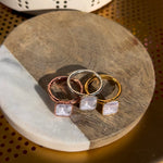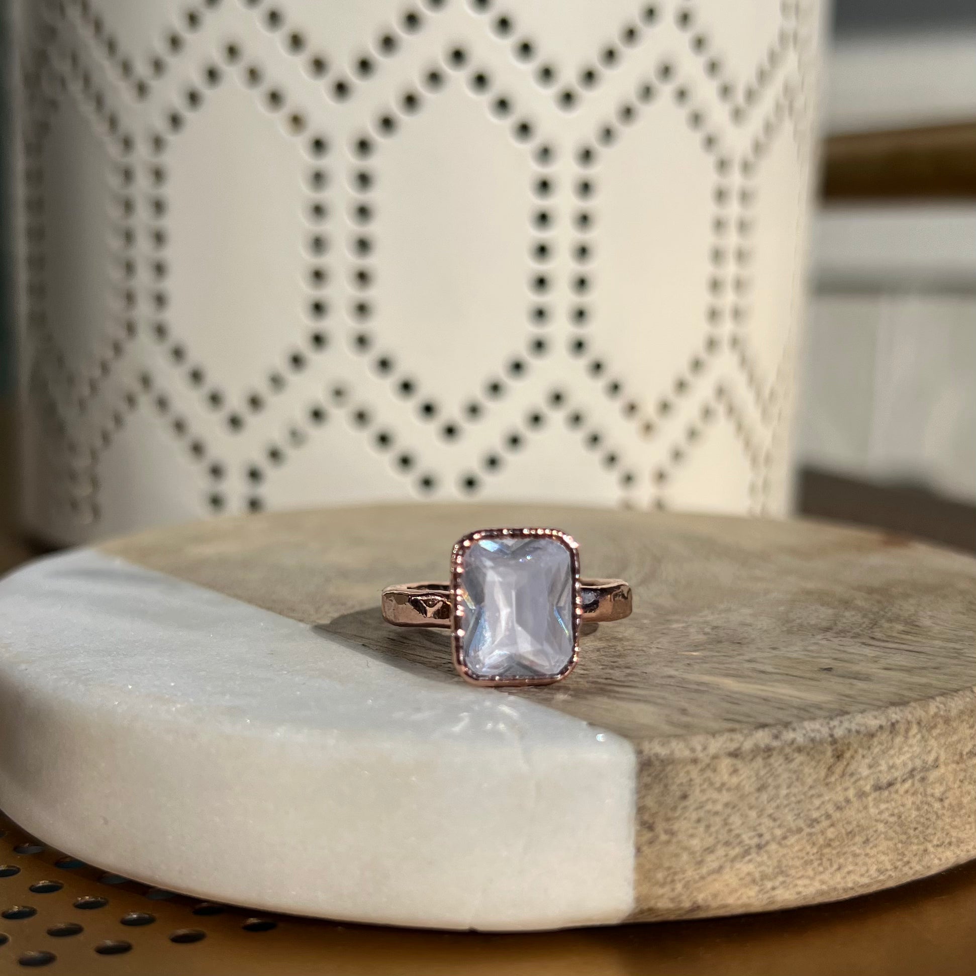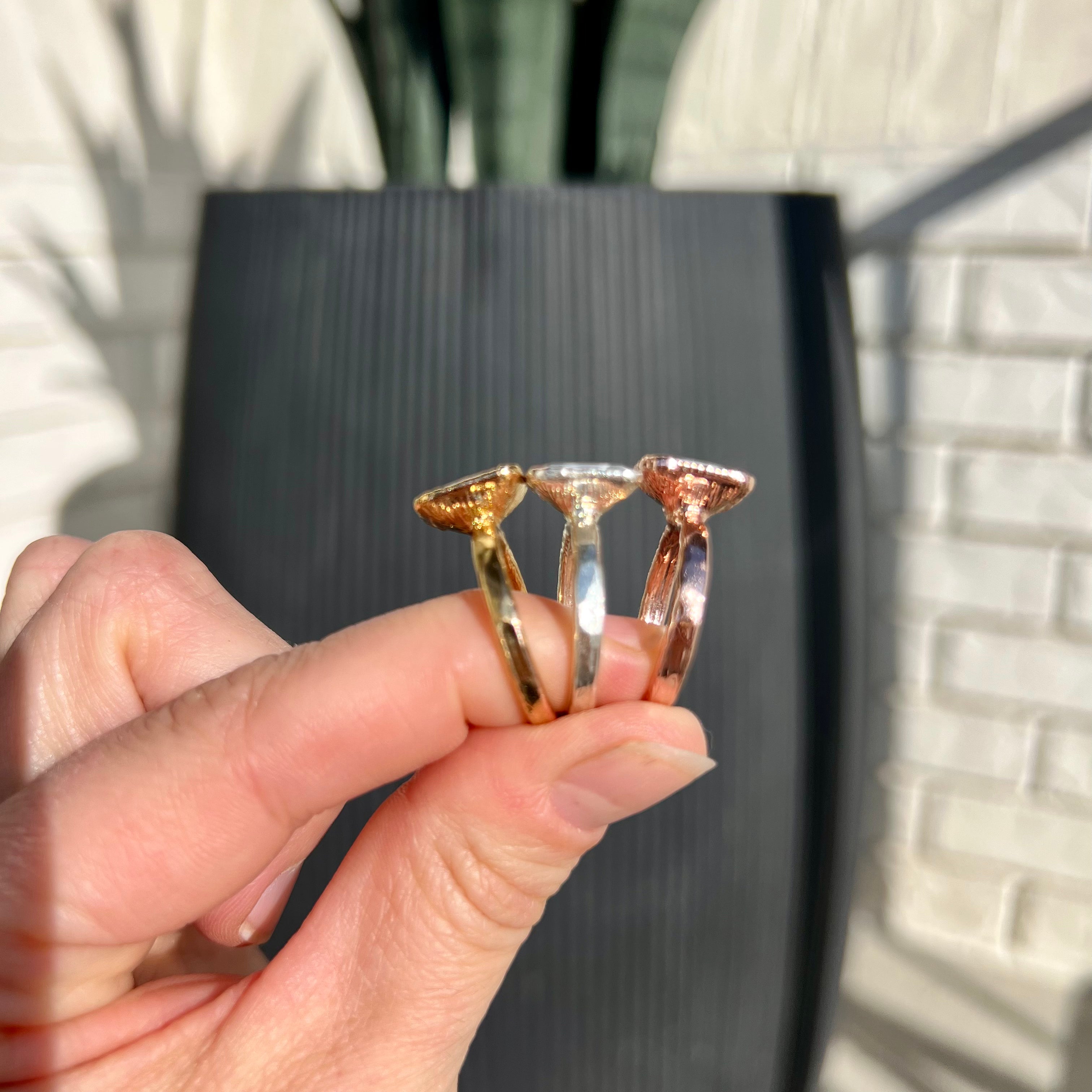 Each stone ring is made using a unique process called electroforming. We start with a simple hammered copper band (or a sterling silver band if you choose the solid silver core option) and transform it into a one-of-a-kind piece that is sure to catch the eyes and capture the hearts of everyone who sees it.
